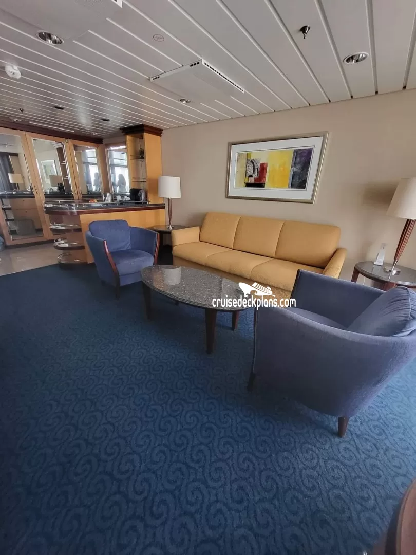 Concierge Service / Priority Check In / Priority Debarkation / Priority Tender Boarding / Reserved Show Seats / Dining in the Stateroom / Exclusive Lounge / Exclusive Full Breakfast Restaurant / Thick Cotton Robes / Pillow Menu / All day access to Coastal Kitchen on Icon, Oasis and Quantum class ships / Specialty Bottle Water / 1 day pass to Spa Thermal Room / Luxury Bath Amenities / Luxury Pillowtop Matress / Suite only sun deck / Suite only beach on private island