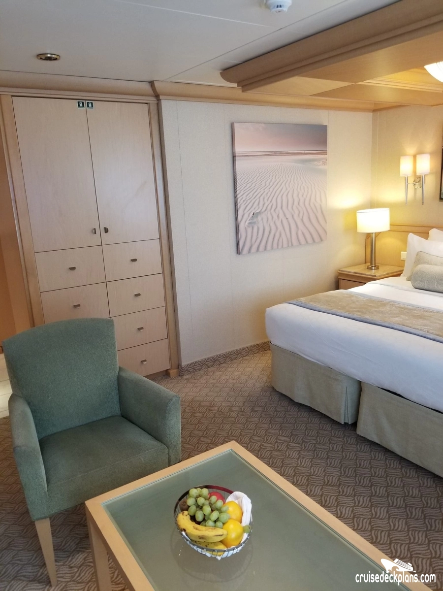 Priority Check In / Priority Debarkation / Priority Tender Boarding / Dining in the Stateroom / Afternoon Canapes / Afternoon Tea / Welcome Champagne / Exclusive Lounge / Exclusive Full Breakfast Restaurant / Priority Dining Reservations / Complimentary Laundry / Complimentary Photo(s) / Thick Cotton Robes / Pillow Menu / Upgraded balcony furniture including loungers, dining tables and chairs / complimentary mini-bar set-up / CD/DVD player with access to complimentary DVD library / Pillow-top mattress / Egyptian cotton high thread bed linens / fresh orchid in stateroom / upgraded bathroom amenities including bath salts and soothing gel eye mask / private lounge at the conclusion of the cruise / priority shore excursion reservations / priority line at service desk / use of Lotus Spa Thermal Suite / exclusive suite breakfast in Sabatinis (includes Mimosa) / exclusive elite lounge with hors d'oeuvres / extended room service menu with full menu offerings / complimentary cover charge for specialty restarants on embarkation evening / Chefs welcome goodies on embarkation day / complimentary flower corsage and boutonniere on first formal night / turndown service includes chocolate dipped stawberries or wrapped chocolates /