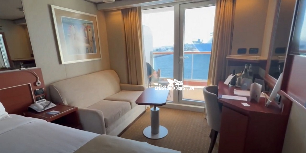 Balcony is 5.5 feet deep. Category VQ on Observation deck has a small narrow balcony. Indented balconies on deck 5 (where the deck is narrow) are 4.5 feet deep.