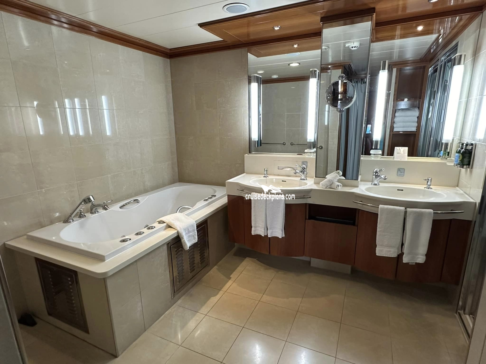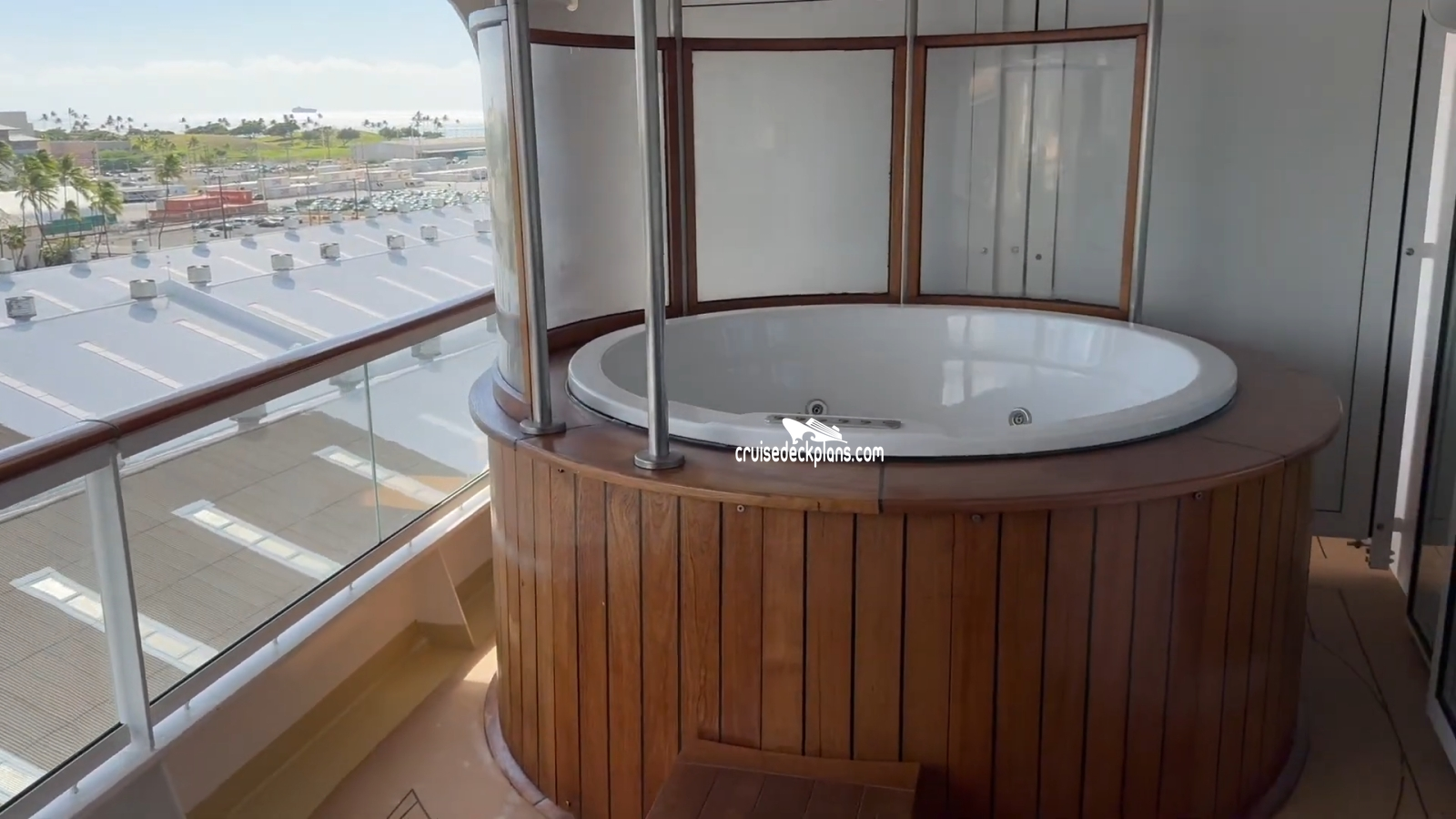Cabin size ranges from 528 to 690 square feet with 185 to 280 square foot balconies. There is no hot tub on Deck 13 balconies for this category. Stateroom 10000 and staterooms on deck 11 and deck 13 DO NOT have a guest bath.