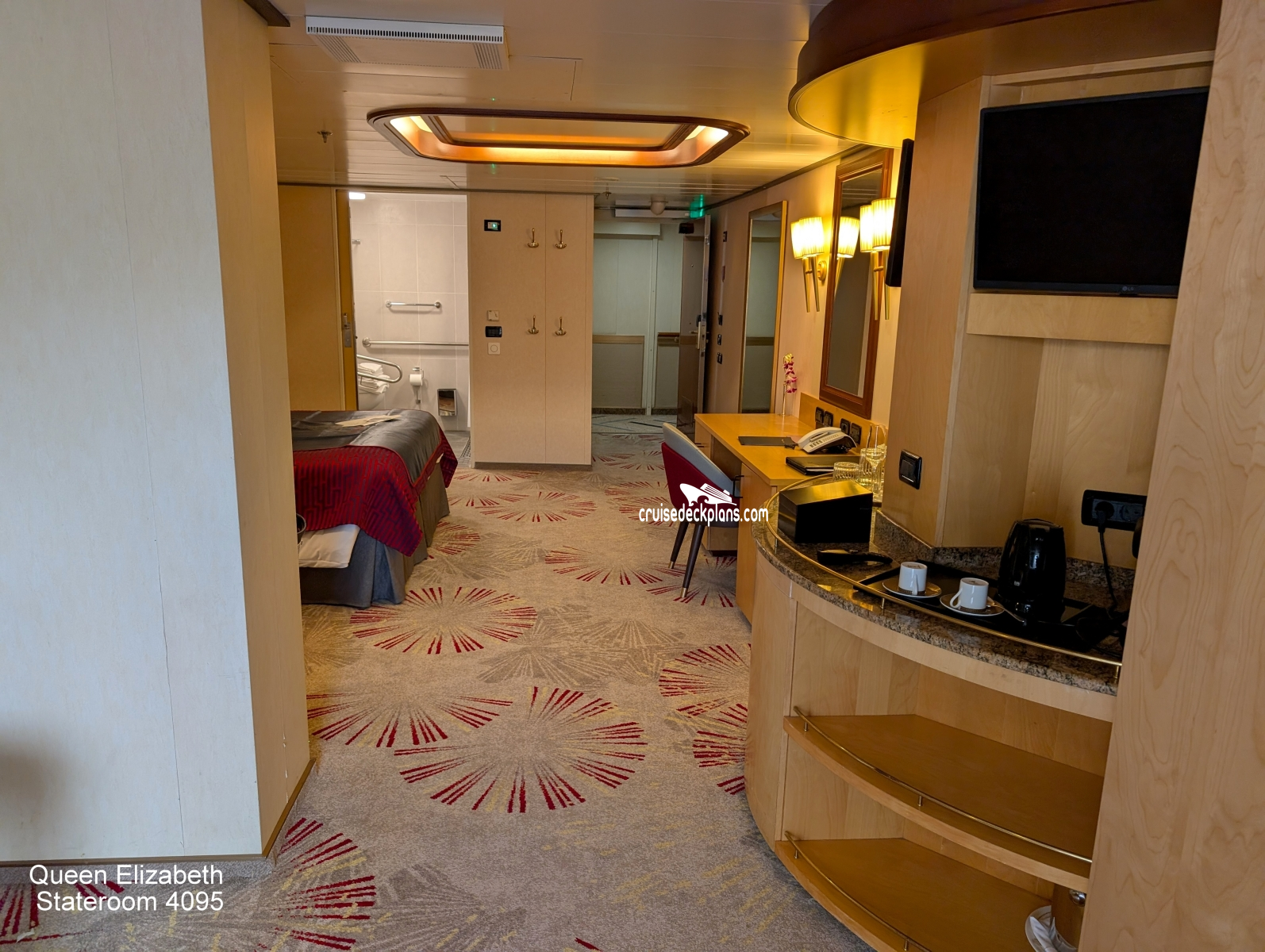 Queen Elizabeth Princess Suite cabin location, stateroom cabin videos, stateroom cabin pictures, floor plans, diagrams, stateroom features and perks. Cruisedeckplans.com also provides links to actual stateroom cabin pictures and videos on this page. You can see details and floor plans for all of Queen Elizabeth's different stateroom cabin categories on the NEW cabins page.