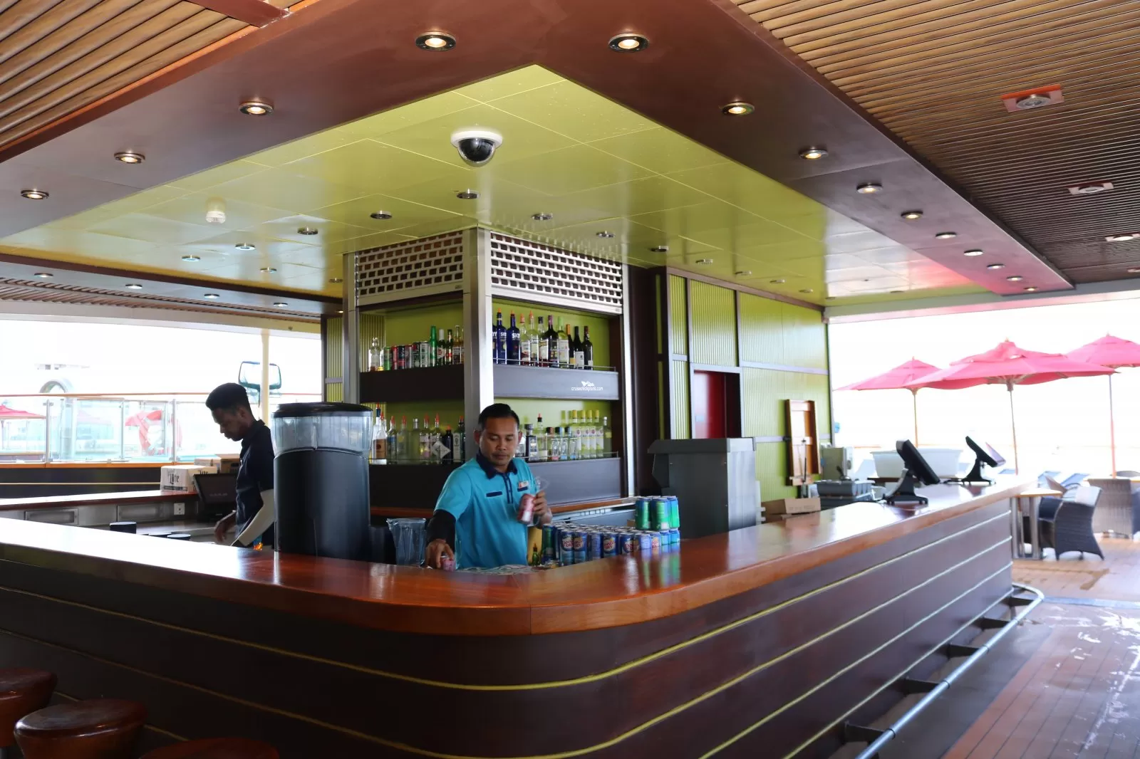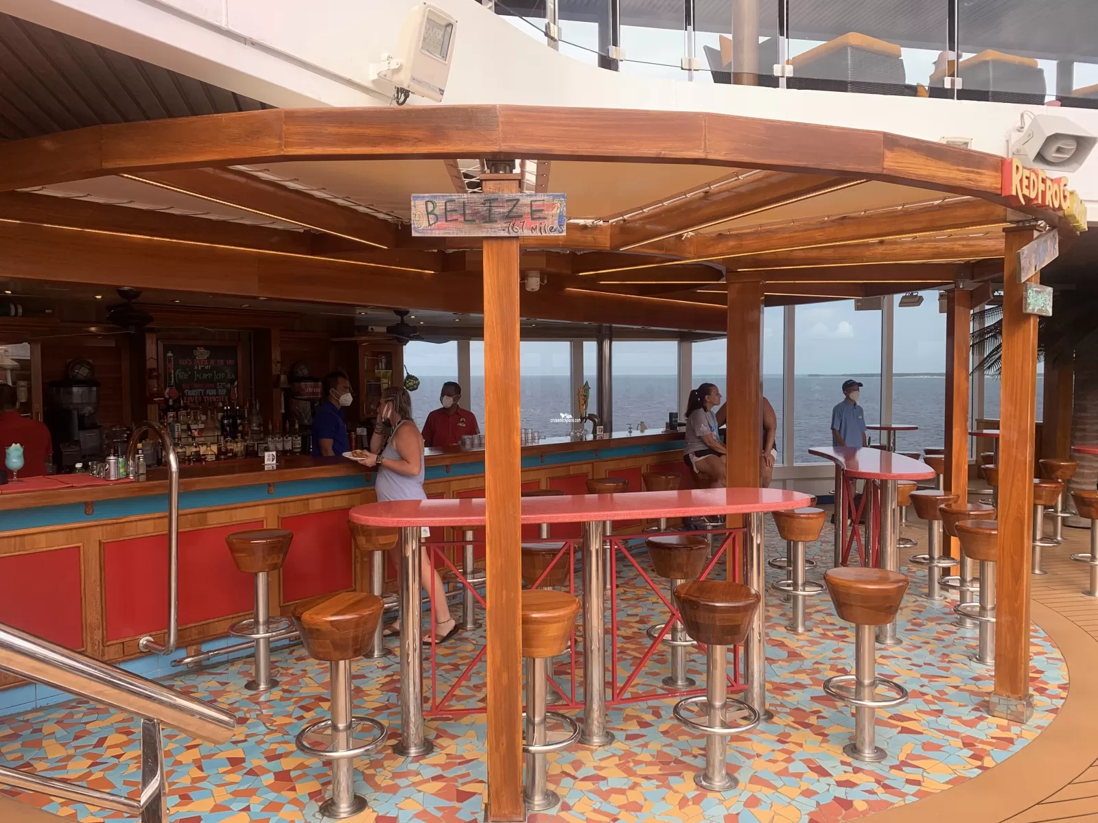 The ships casual international style buffet restaurant. Seats 826. Breakfast is served from 7:00 to 10:30 a.m. Lunch is served from 12:00 to 2:30 p.m. and dinner is served from 6:00 to 9:30 p.m. (ALL TIMES SUBJECT TO CHANGE). There is a Deli open from 11:00 a.m. to 11:00 p.m. Pizza Pirate is open 24 hours a day. Swirls serves self serve icecream and frozen yogurt.Tides Bar