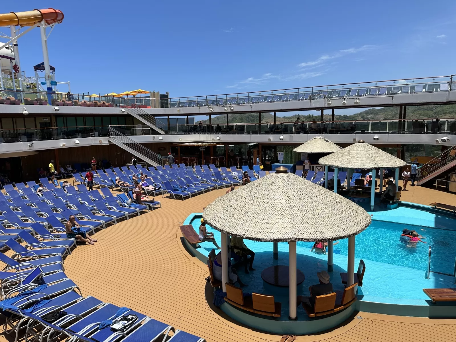 Aft pool with 2 hot tubs. Typically opened from 8:00 a.m. to midnight. Saltwater pool that is 21 feet long and 16 feet wide. It is 4 feet 6 inches deep.Beach Pool