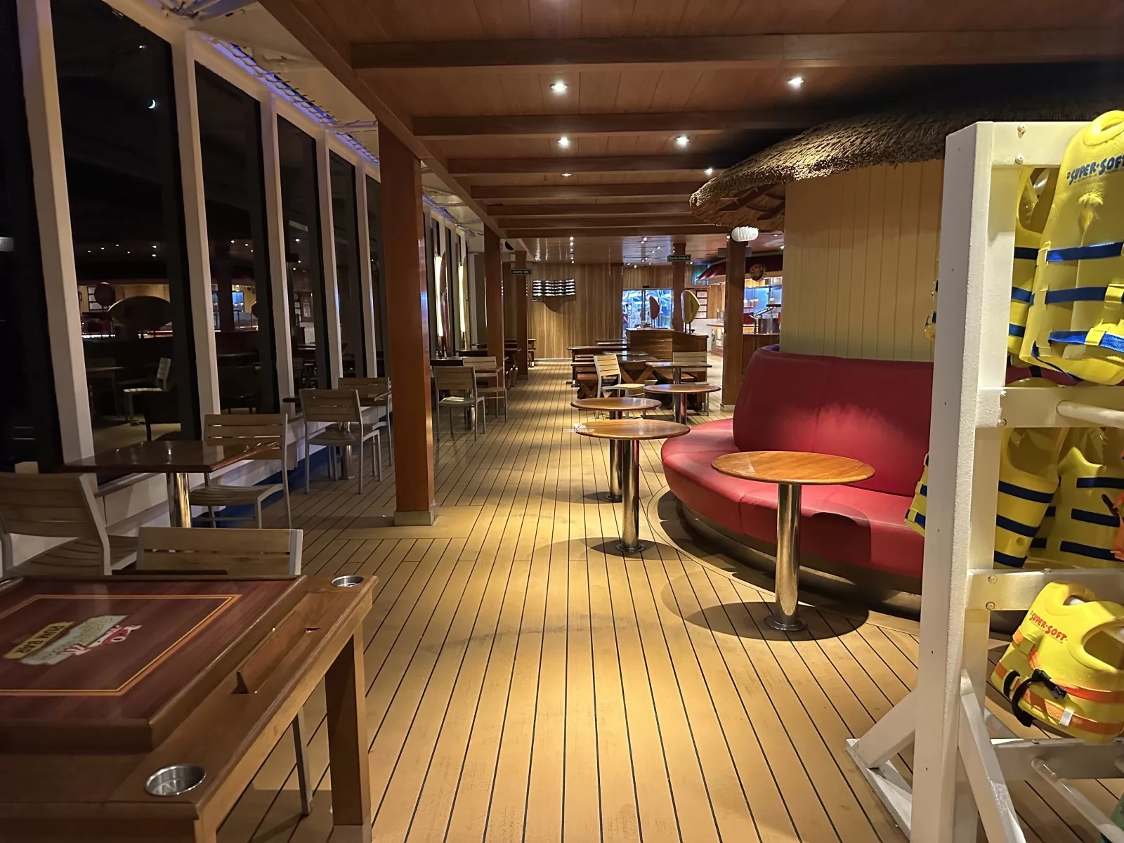 Main Pool area that spans 3 decks and is covered by glass roof. Typically open from 8:00 a.m. to 12:00 a.m. Salt water pool that is 30 feet by 16 feet wide and 4 feet 6 inches deep.Red Frog Rum Bar