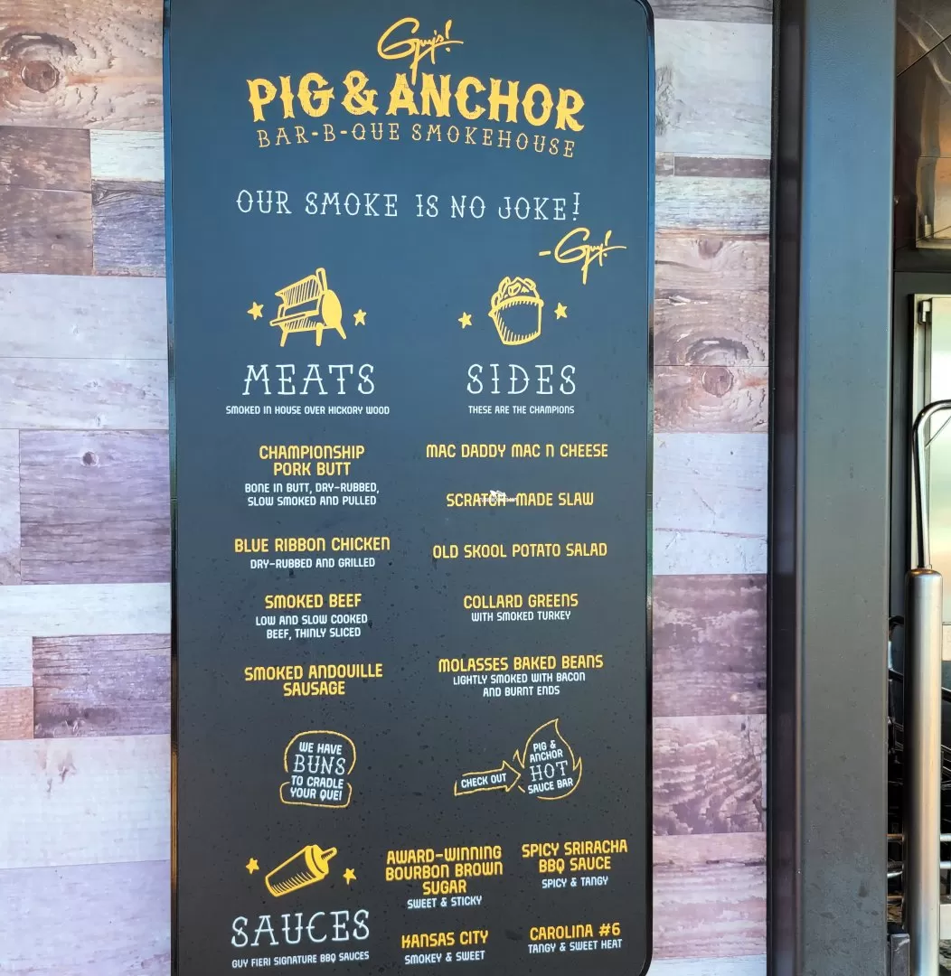 Hours: 12:00pm-2:30pm on sea days. Complimentary. Guys Pig & Anchor Bar-b-que Smokehouse. Includes menu items such as Championship Pork Butt, Smoked Andouille Sausage, and Guys famous Blue Ribbon Chicken; as well as sides like Mac Daddy Mac 'n Cheese and Old Skool Potato Salad. Top it all off with Guys line of signature barbecue sauces.Cabin Check Tool