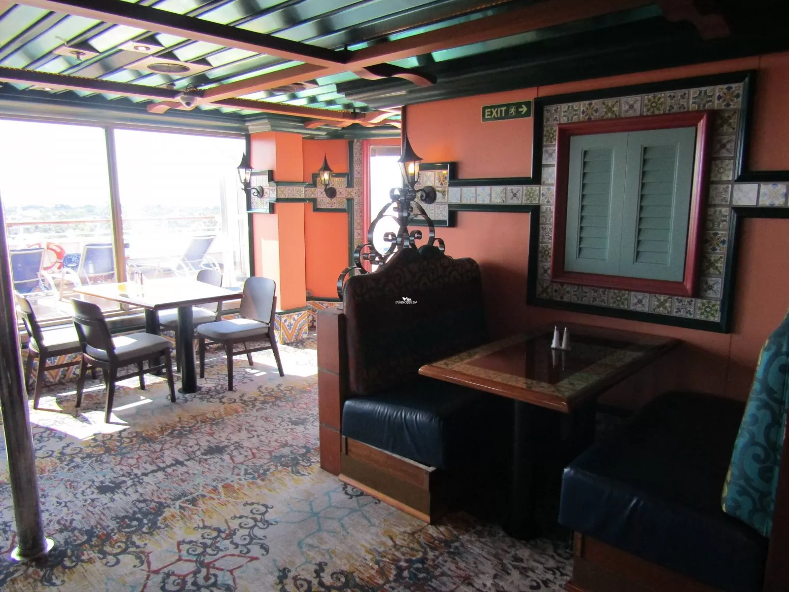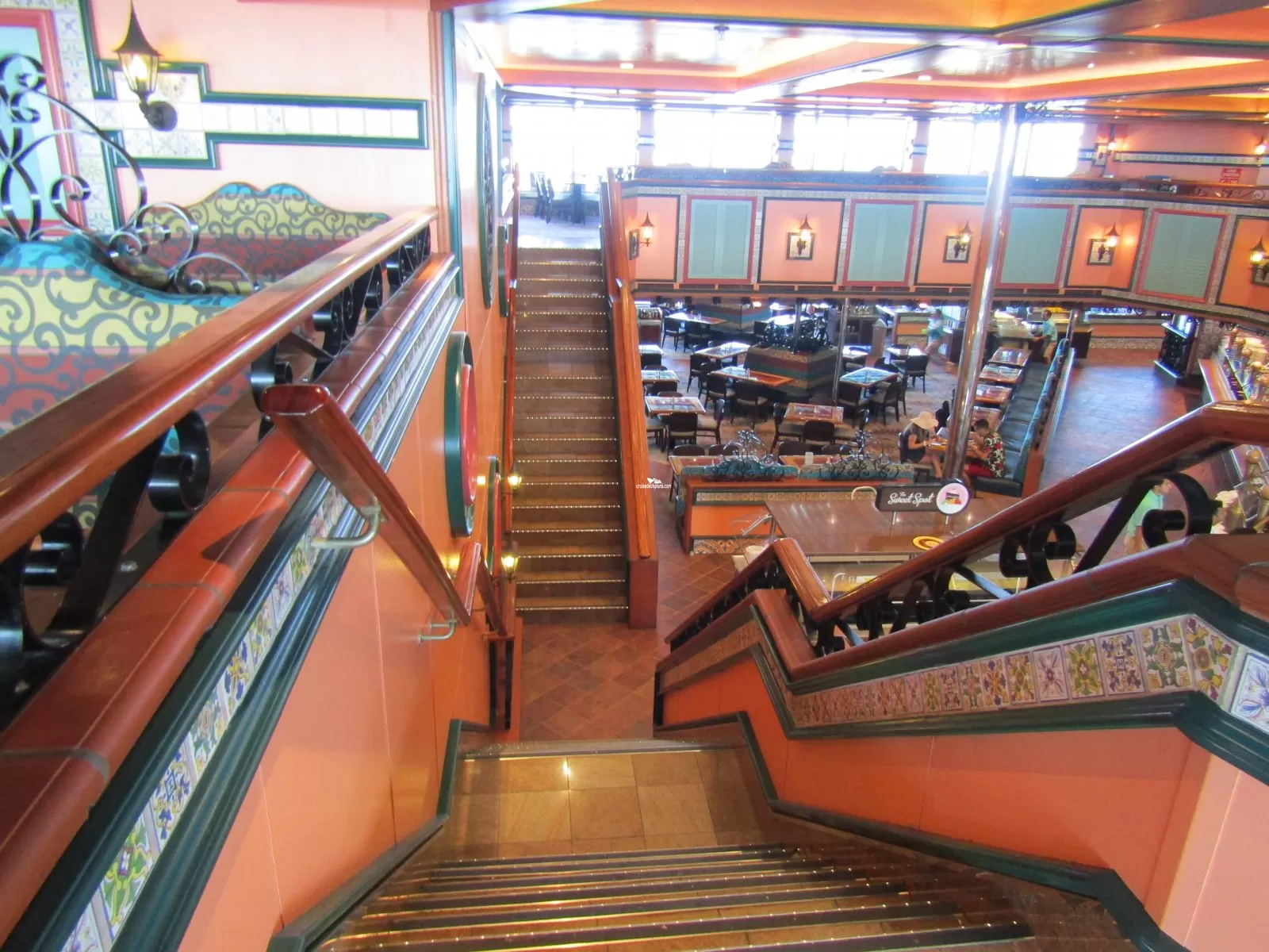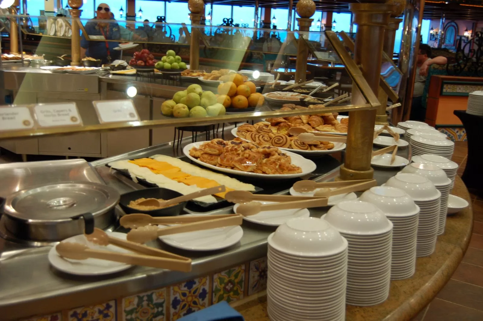 The ships casual International Food Court, accommodating 1252 passengers. Two Stories high. Breakfast is served from 7:00 a.m. to 10:30 a.m. Lunch is served from 12:00 to 2:30 p.m. Dinner begins at 6:00 to 9:30 p.m. Hours may vary.Panorama Sun Deck