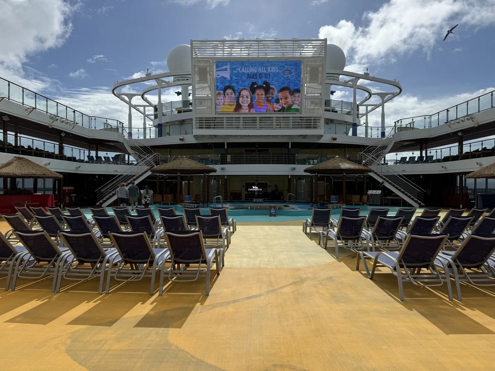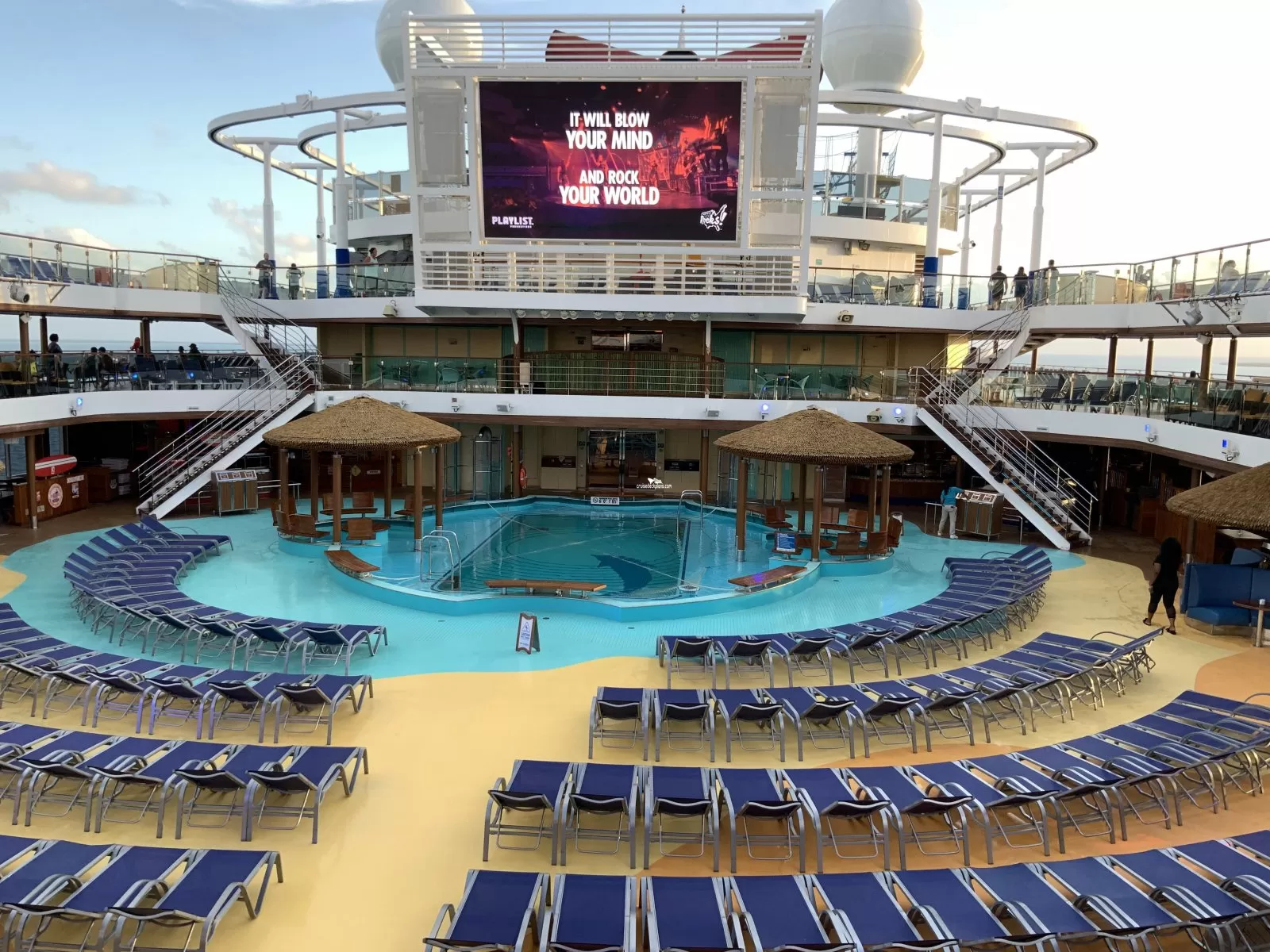Located midship on deck 10 to 12. Large 12 foot by 22 foot LED outdoor TV screen. During evening hours blankets and popcorn is provided to watch Dive-In Movies.Cabin Check Tool