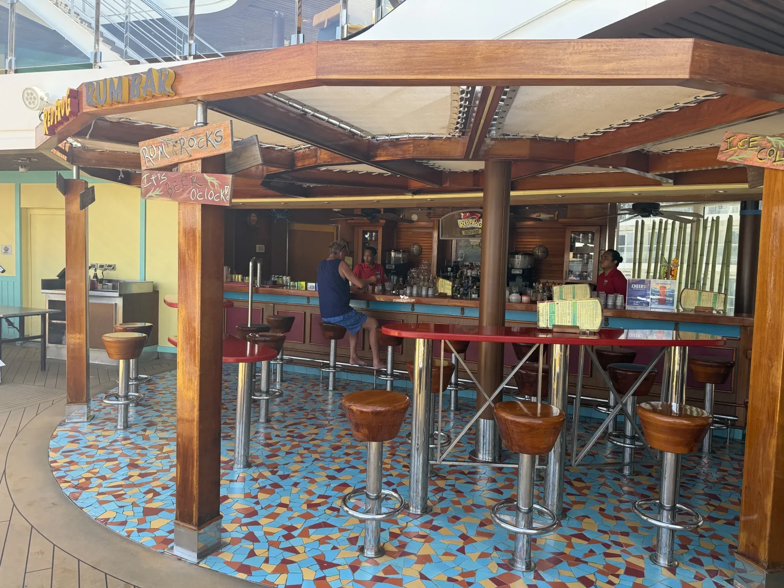 Serves pizza 24 hours a day. Self-service featuring complimentary, delicious, hand-tossed, authentic Italian-style, thin-crusted pies made in a traditional pizza oven. There are dedicated tables and seating.RedFrog Rum Bar