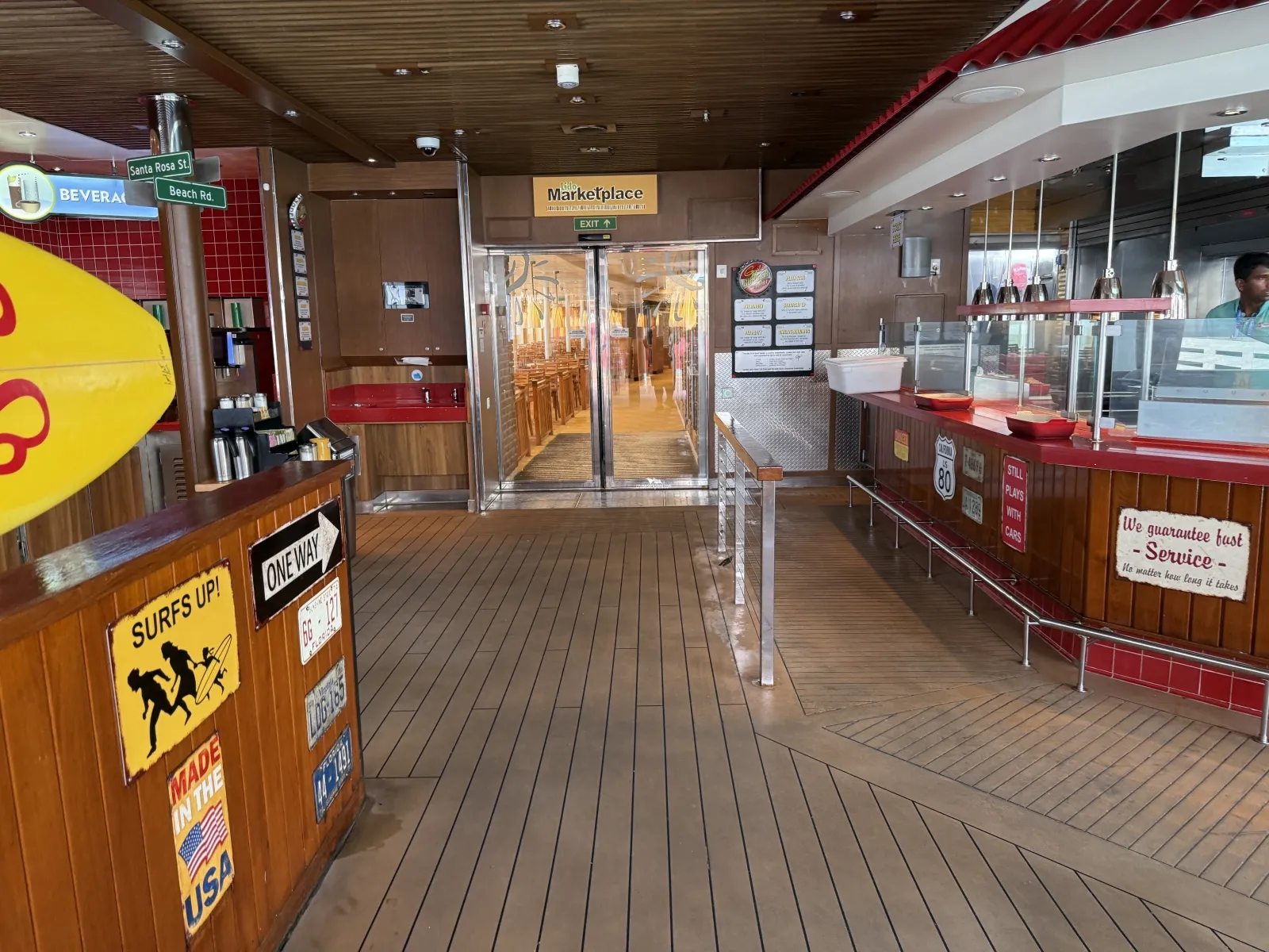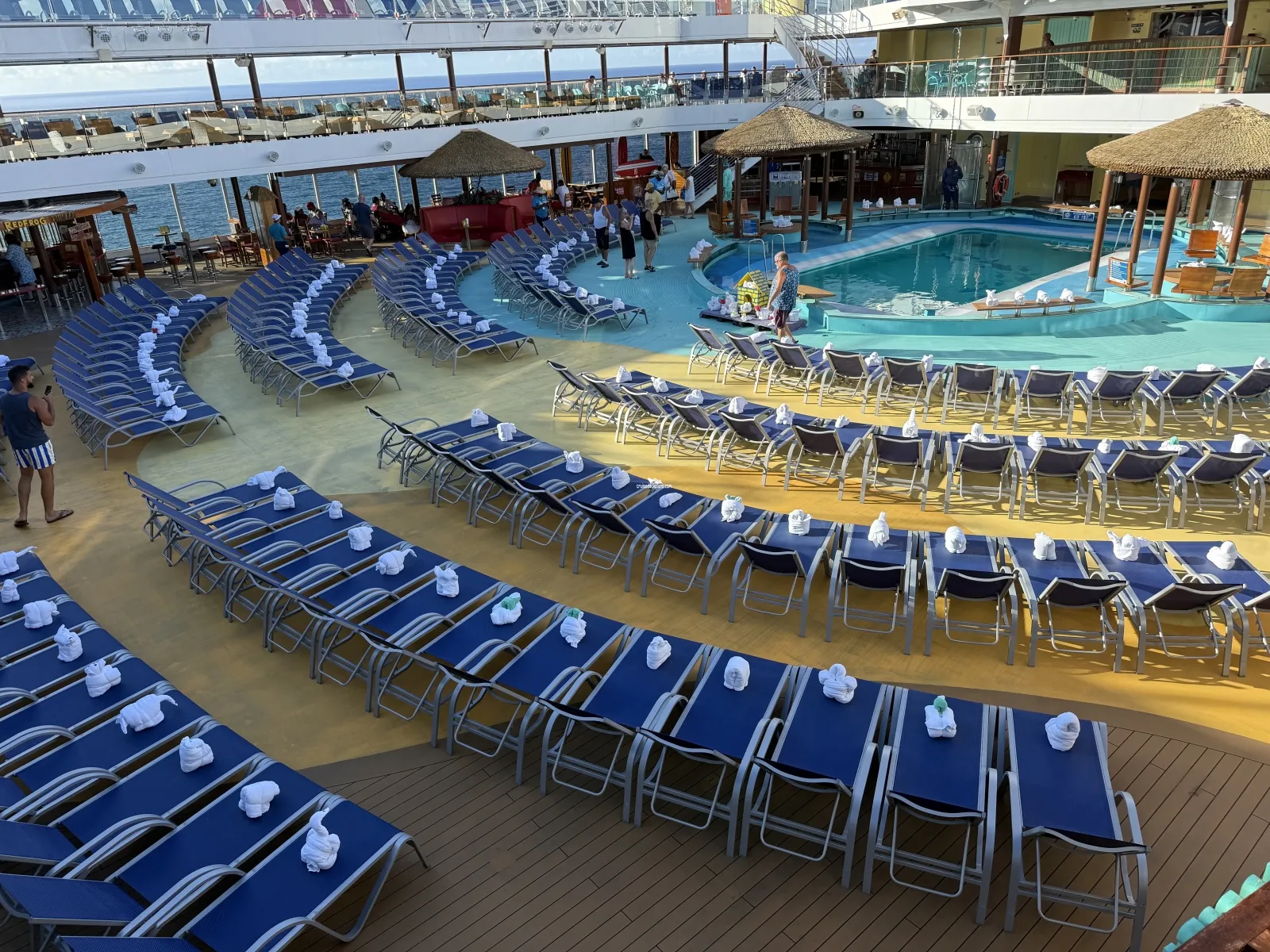 Aft outdoor open-air pool and two whirlpools. Saltwater pool that is 21 feet by 16 feet and 4 feet 6 inch deep. Lounge chairs and umbrellas. There is a bar.Lido Marketplace