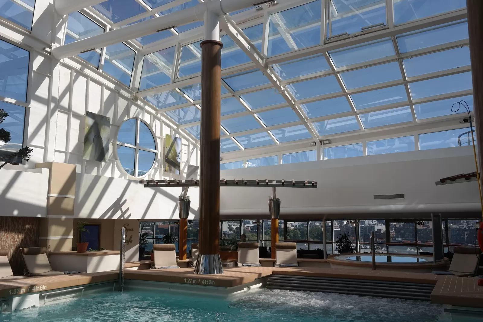 Solarium with glass roof, pool, spa cafe, two hot tubs and loungers.Spa Cafe