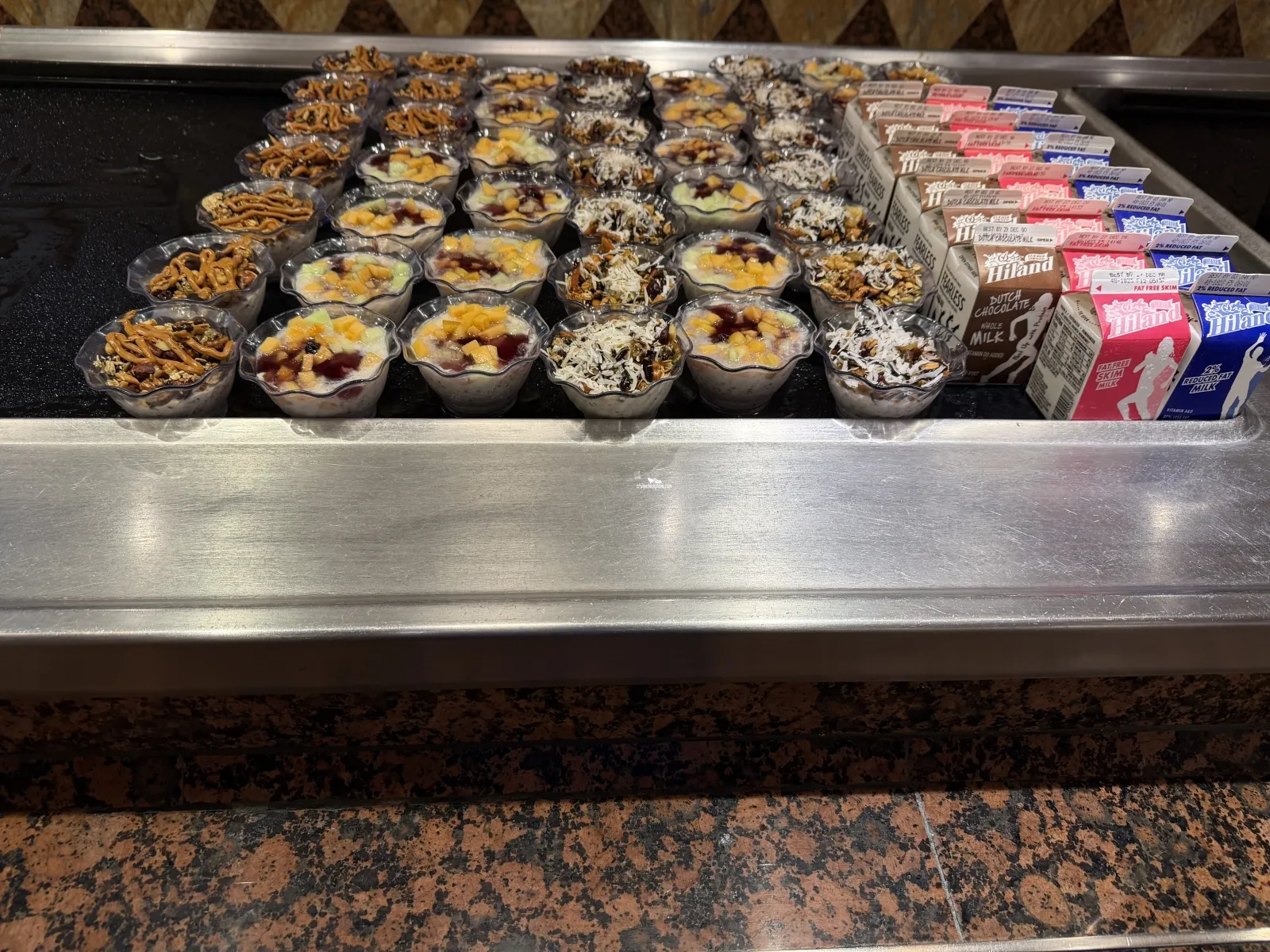 The ships casual international style buffet restaurant. Seats 826. Breakfast is served from 7:00 to 10:30 a.m. Lunch is served from 12:00 to 2:30 p.m. and dinner is served from 6:00 to 9:30 p.m. (ALL TIMES SUBJECT TO CHANGE). There is a Deli open from 11:00 a.m. to 11:00 p.m. Pizza Pirate is open 24 hours a day. Swirls serves self serve icecream and frozen yogurt.Camp Carnival