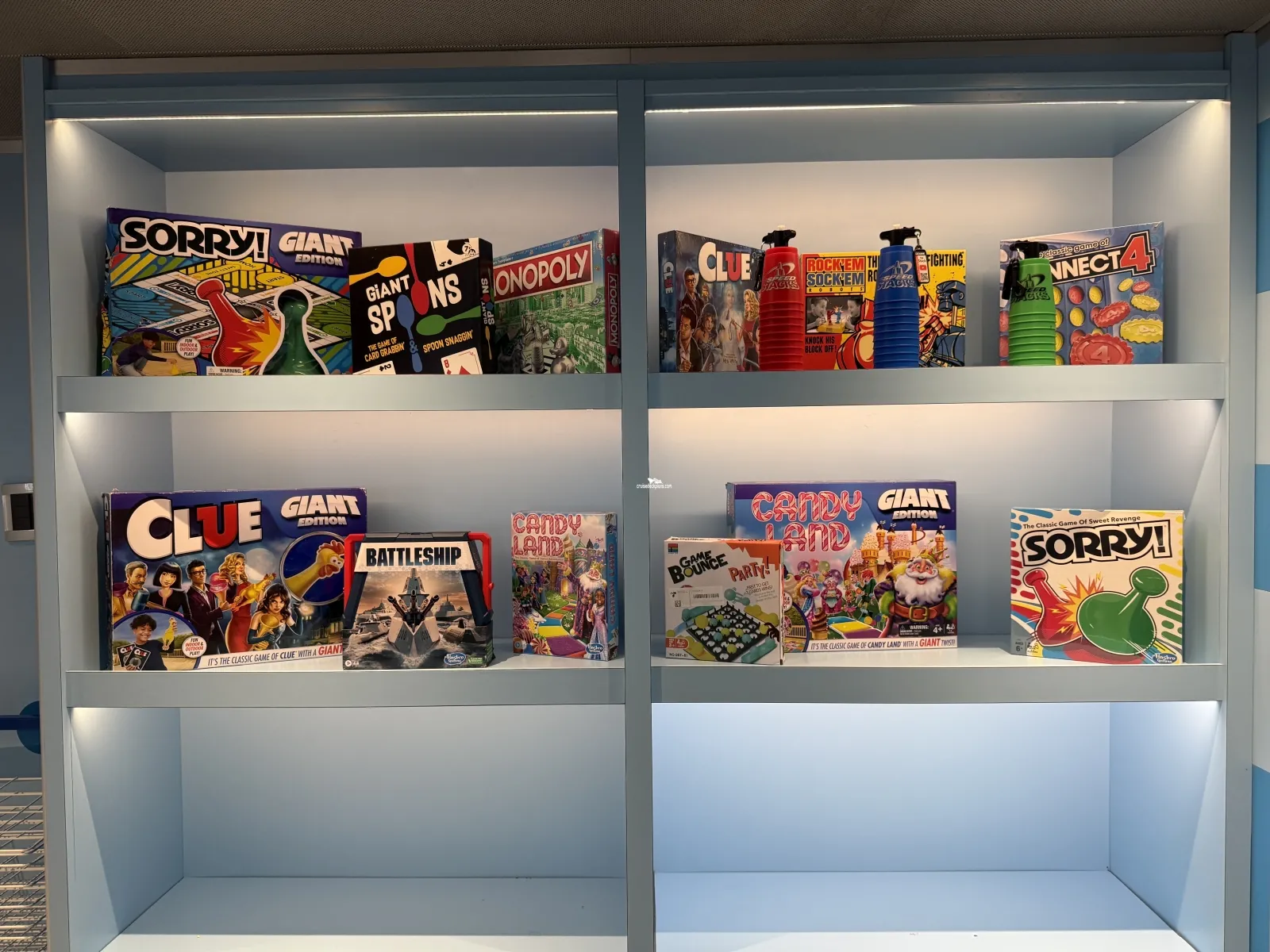 Room decked with bright colors, fun furniture and Dr. Seuss characters on the walls. Provides shelves filled with books for reading.Ji Ji Asian Kitchen
