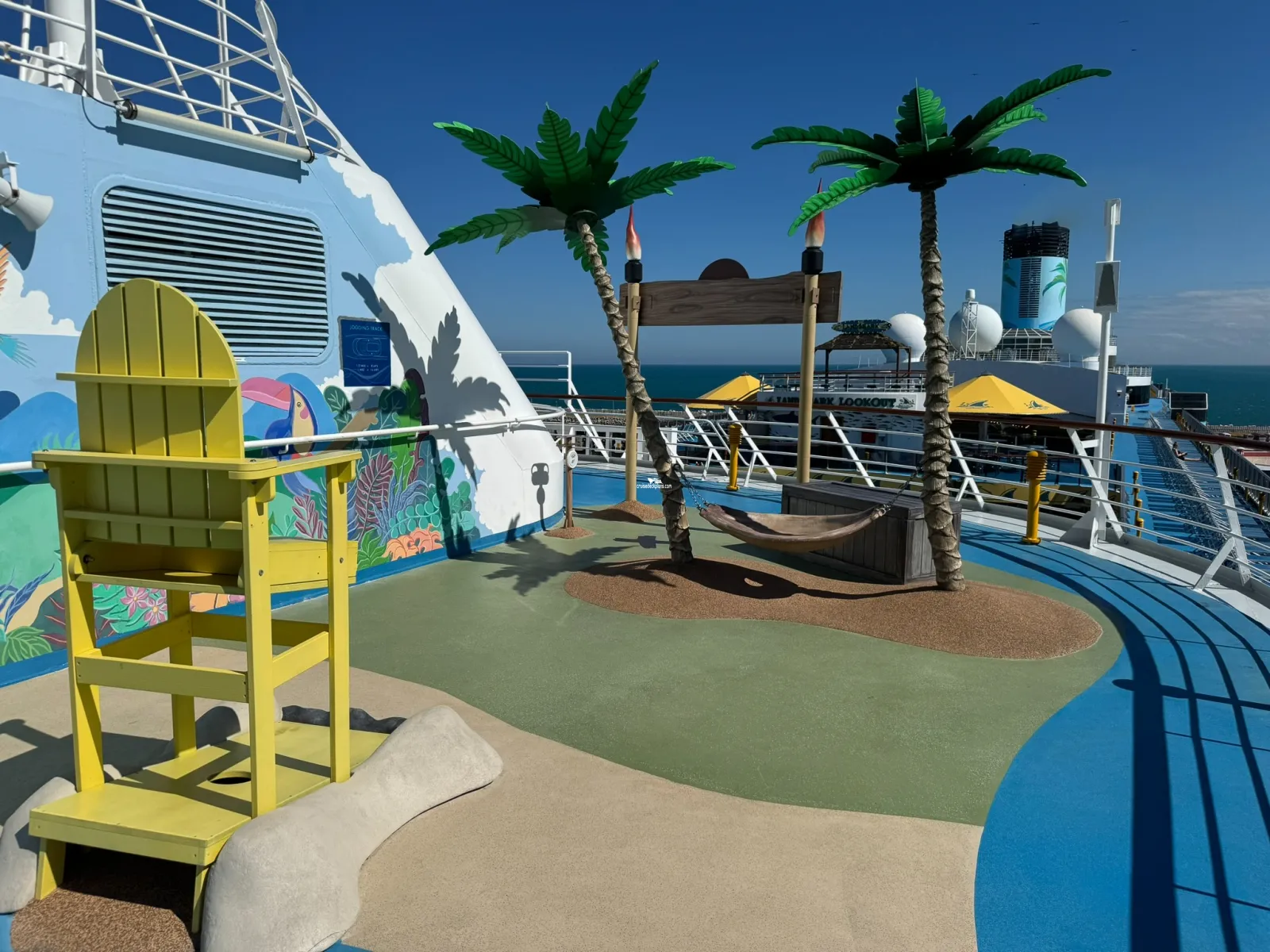 Deck with jogging track, pickle ball court, mini-golf and corn hole.Play Pad and Slide
