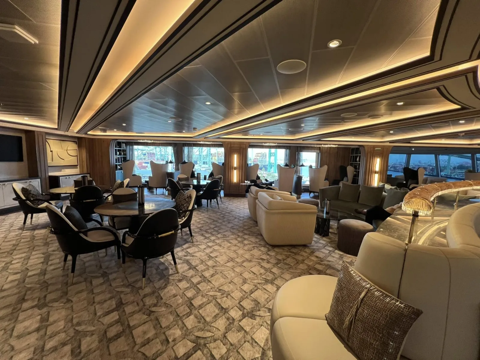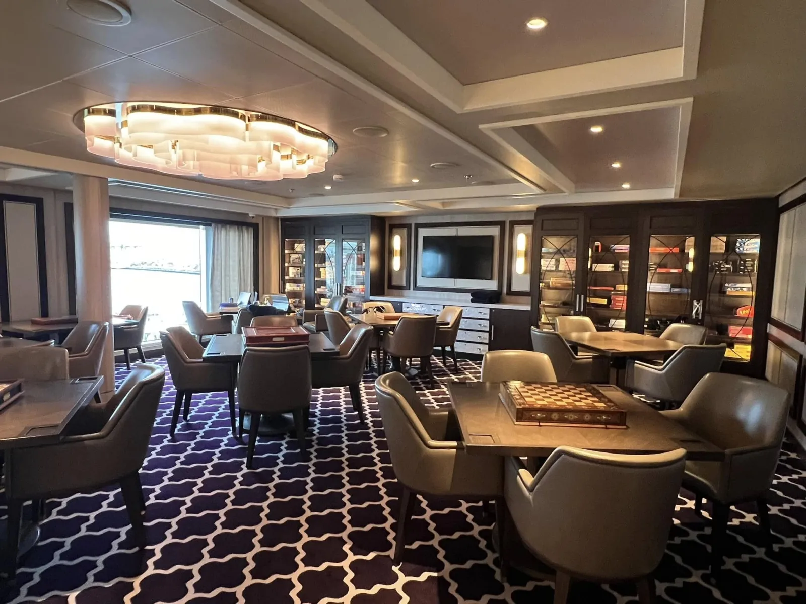Located in the front of the ship, offers 270 degree views through floor-to-ceiling slanted windows. Has a full bar and outside seating area.Card Room