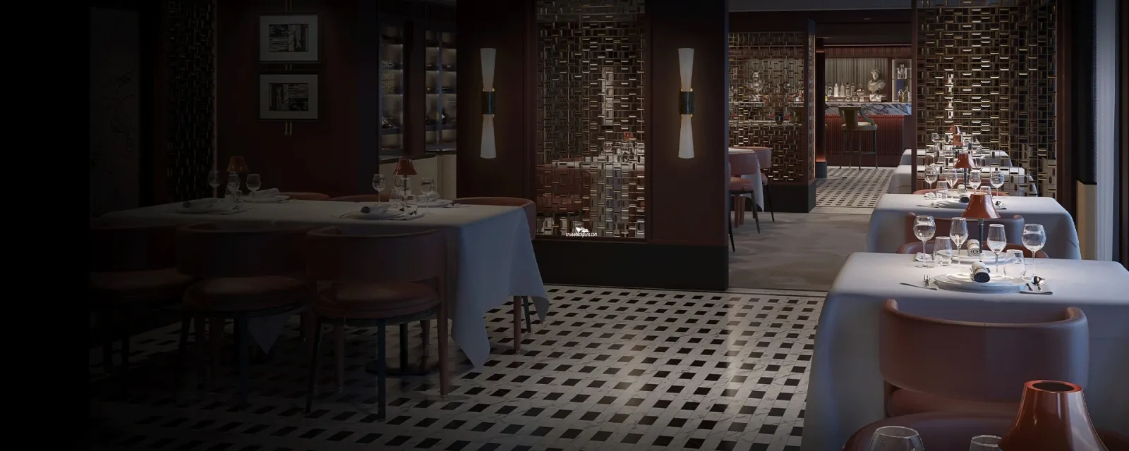 French specialty restaurant located on aft (portside) of ship. Has floor to ceiling windows for enjoying the views while you dine.The Study