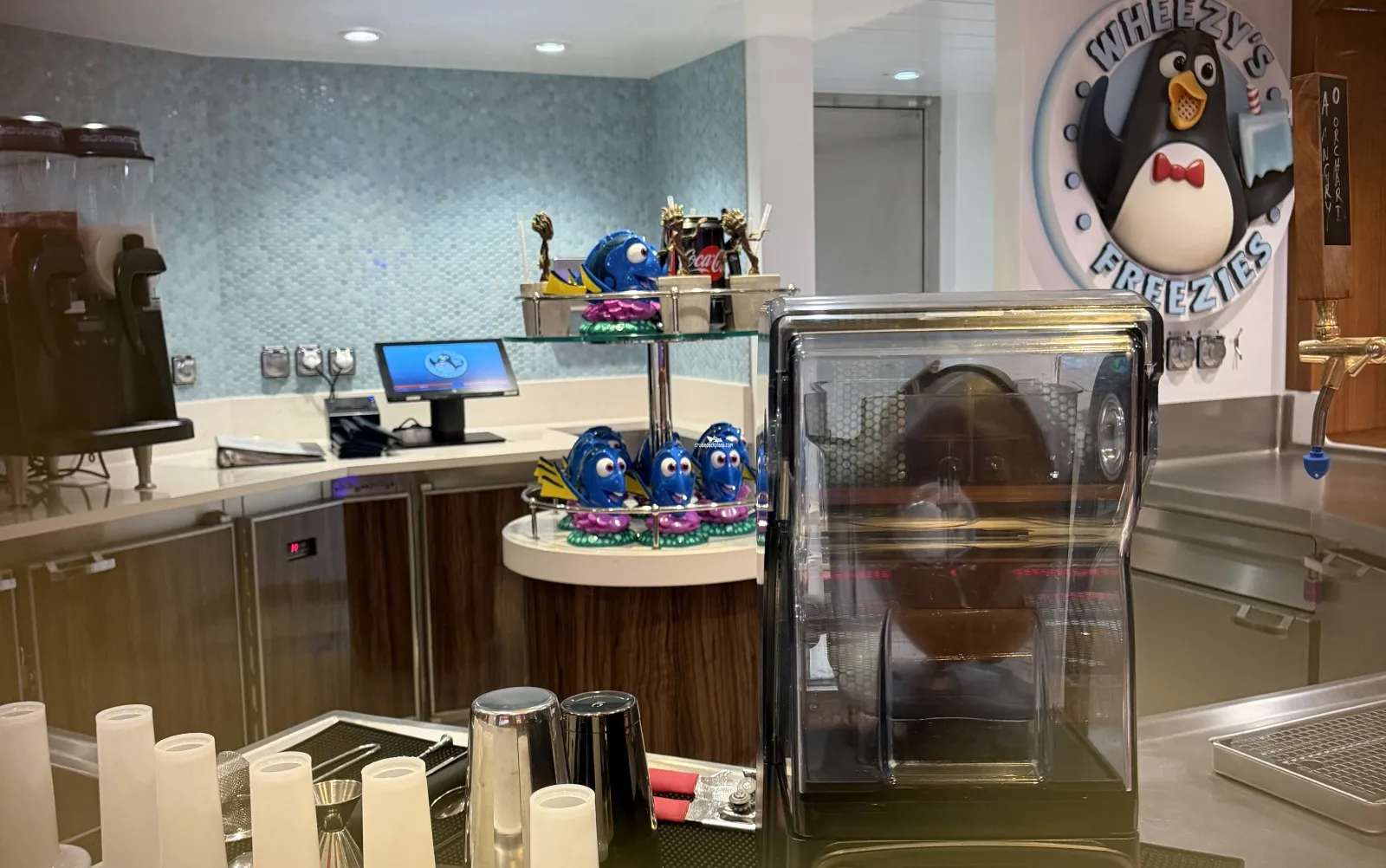 Water play area for families with young children. Features Toy Story characters as rubber bath toys.Wheezies Freezies