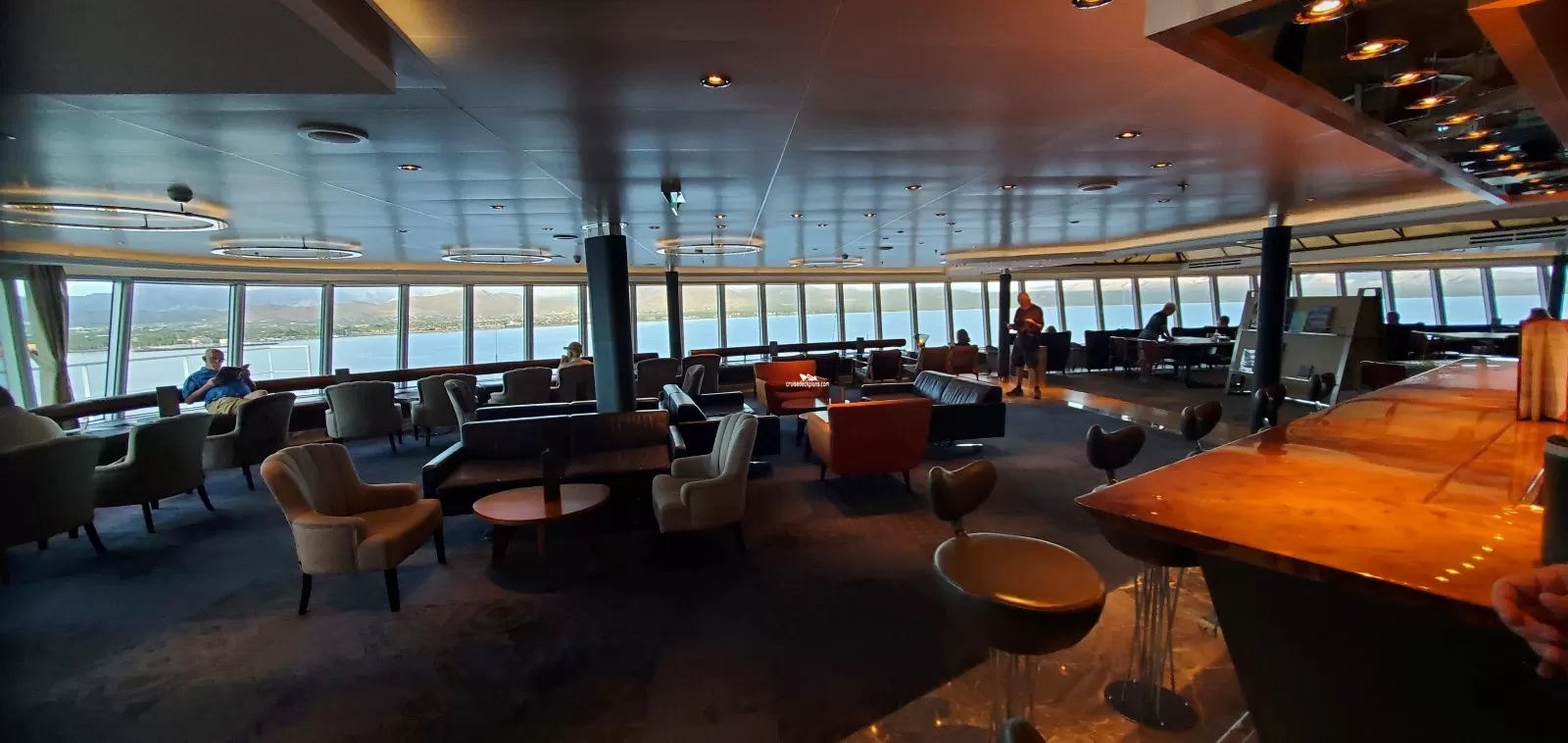 Observation lounge with floor to ceiling panoramic views. Has its own bar and dance floor. Accommodates 269 guests.Explorations Cafe