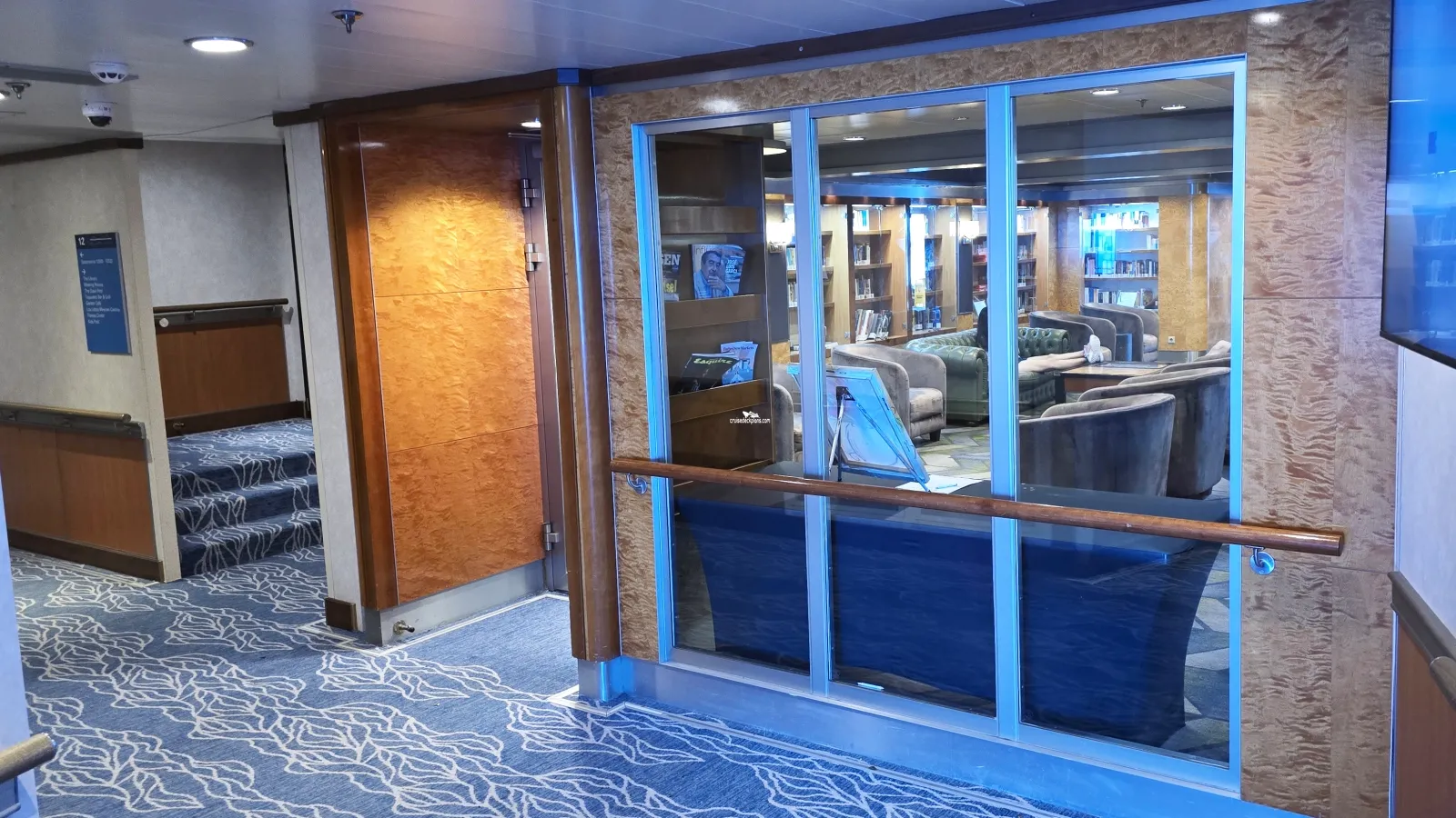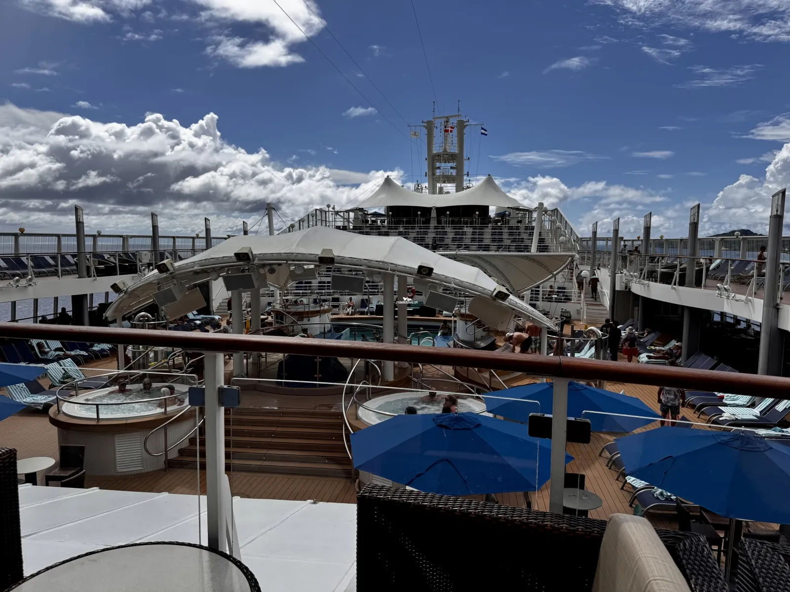 Large pool with 4 hot tubs and statium style lounge chairs. Nearby bar and ice cream bar. This is the place the ship also has out door cook outs.Library
