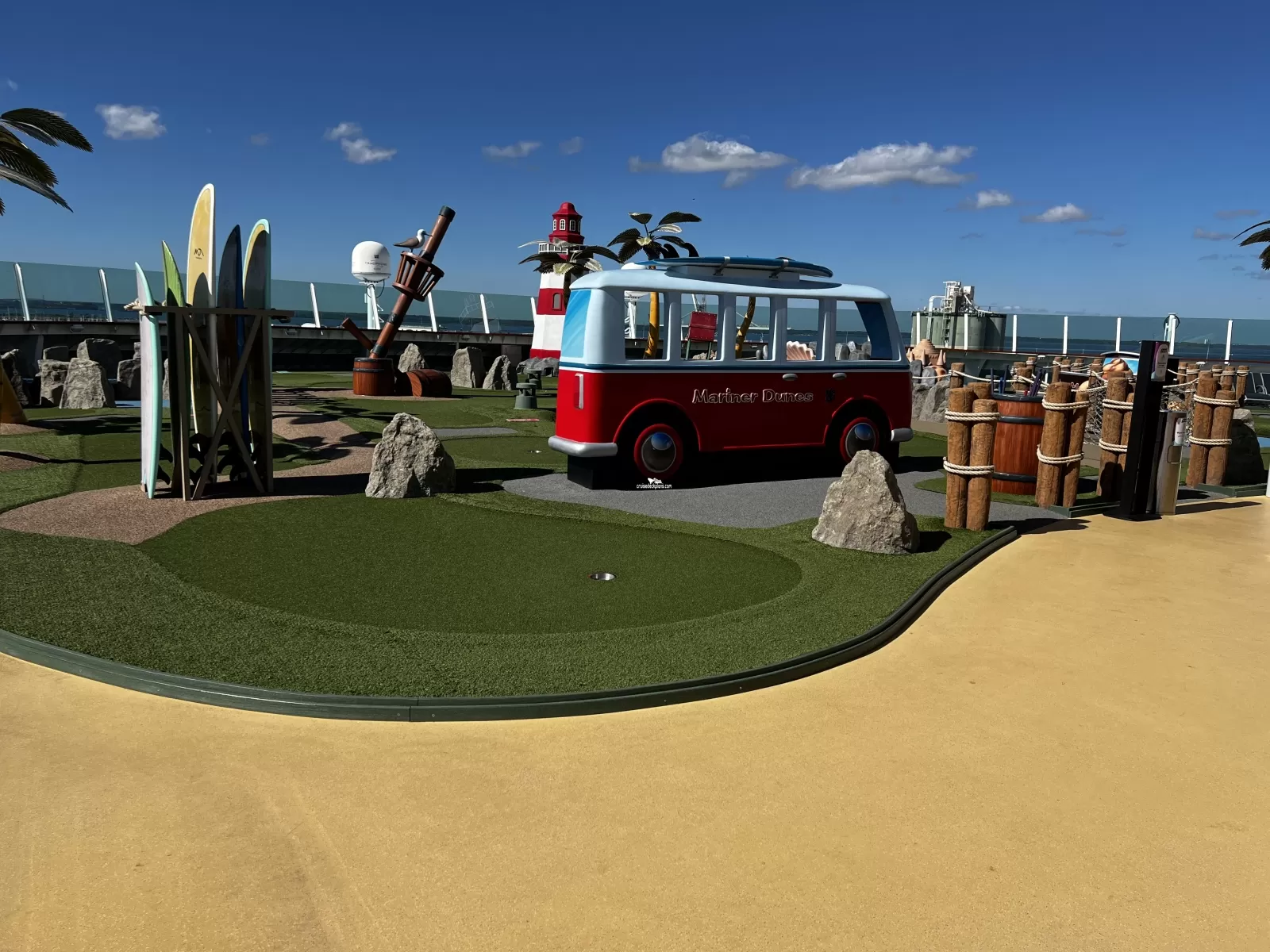 The ship's complimentary 24 hour 9 hole miniature golf course. All equipment is provided in containers by the painted mural of a golf course.Sports Court