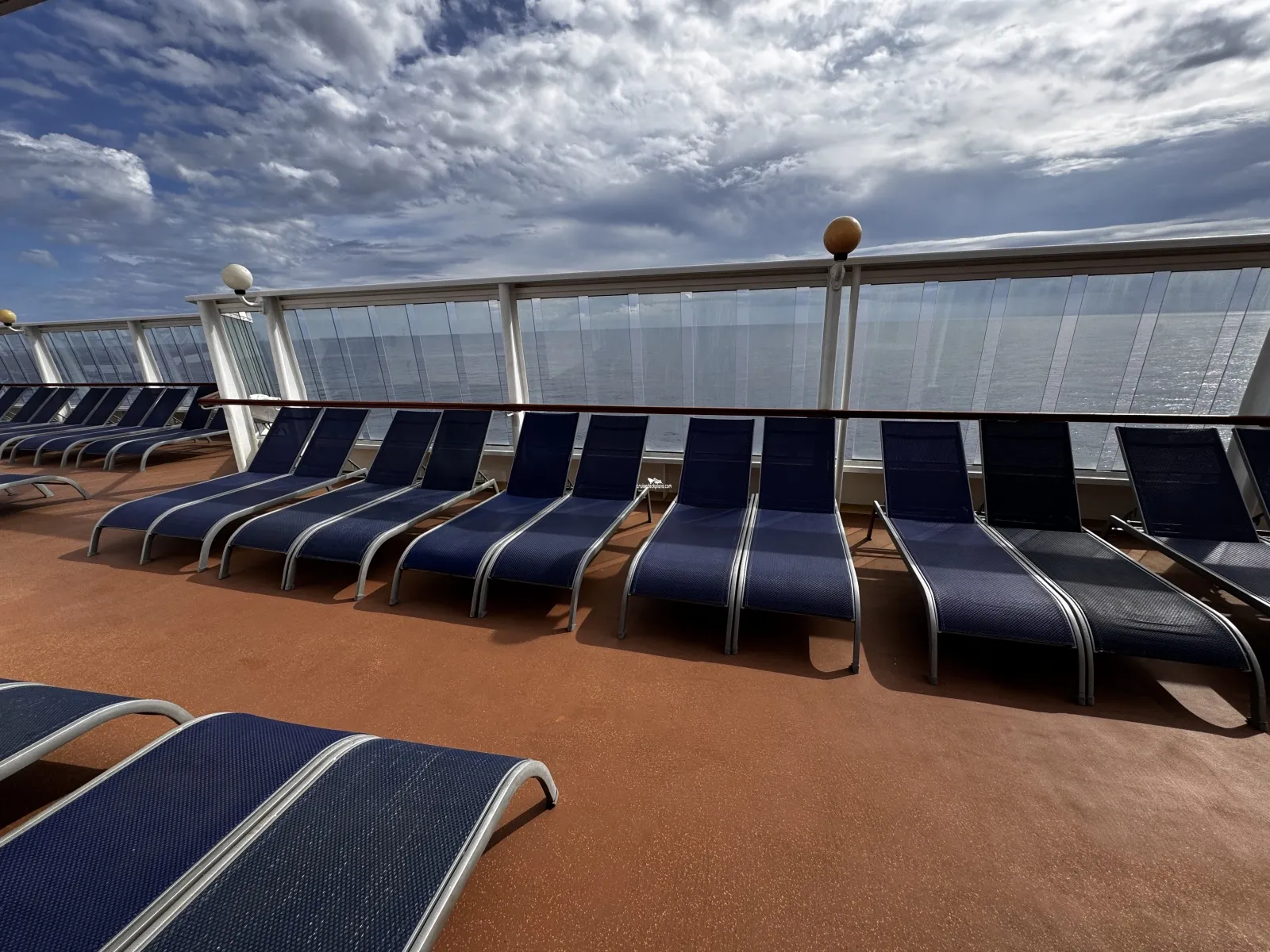 Jogging track that makes loop around pool and back to aft of the ship. Parts of the track may have walkers crossing. Area around the pool is also used for pool loungers.Sun Deck Forward