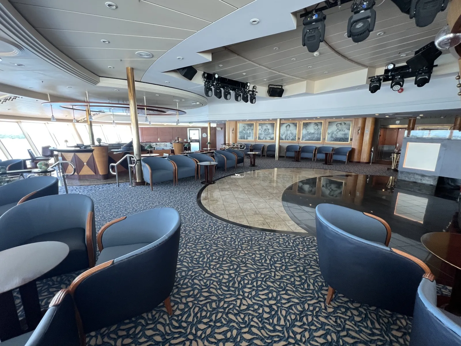 The lounge's centerpiece offering a bar, bandstand, and dance floor.Diamond Club