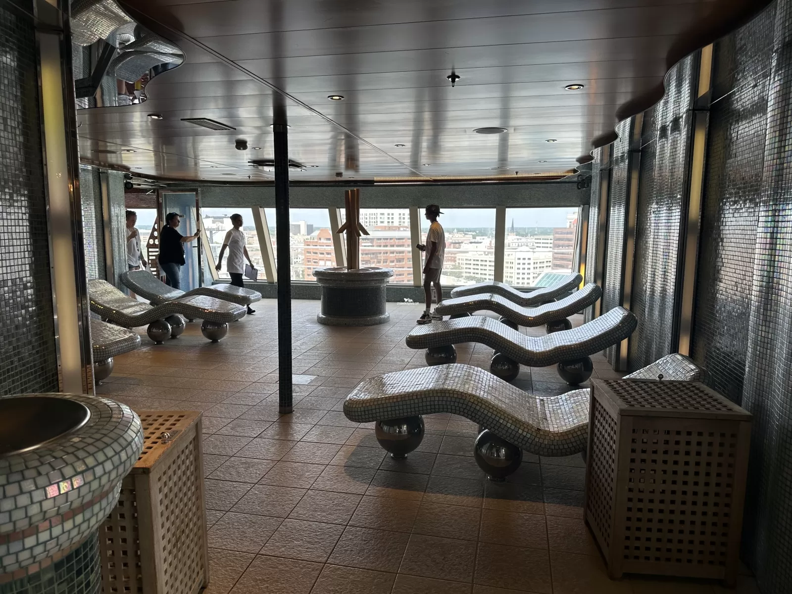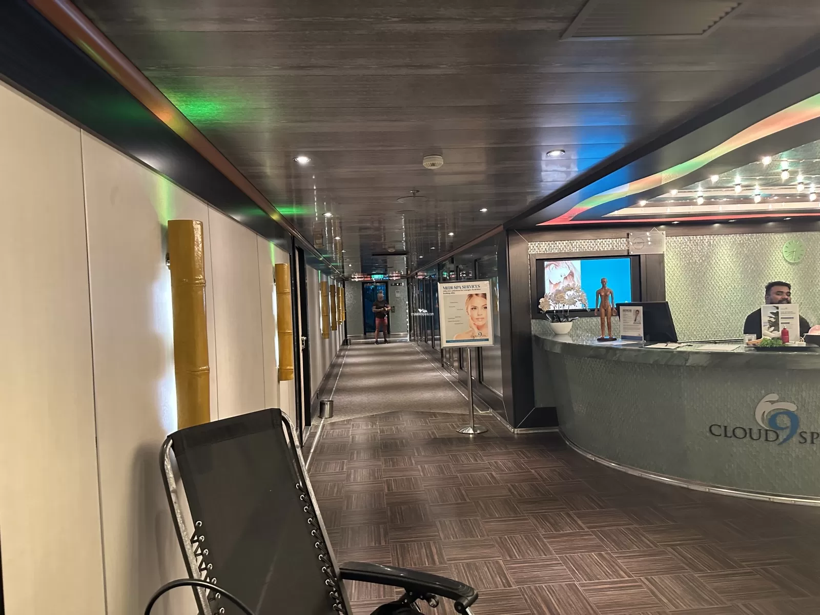 Cloud 9 Spa and fitness area with reception area, 2 saunas, changing rooms, treatment rooms, VIP suites, Thalassotherapy pool, Thermal suites, and fitness studio. 2 Levels. Spa opens at 8:00 a.m.Thalassotherapy Pool