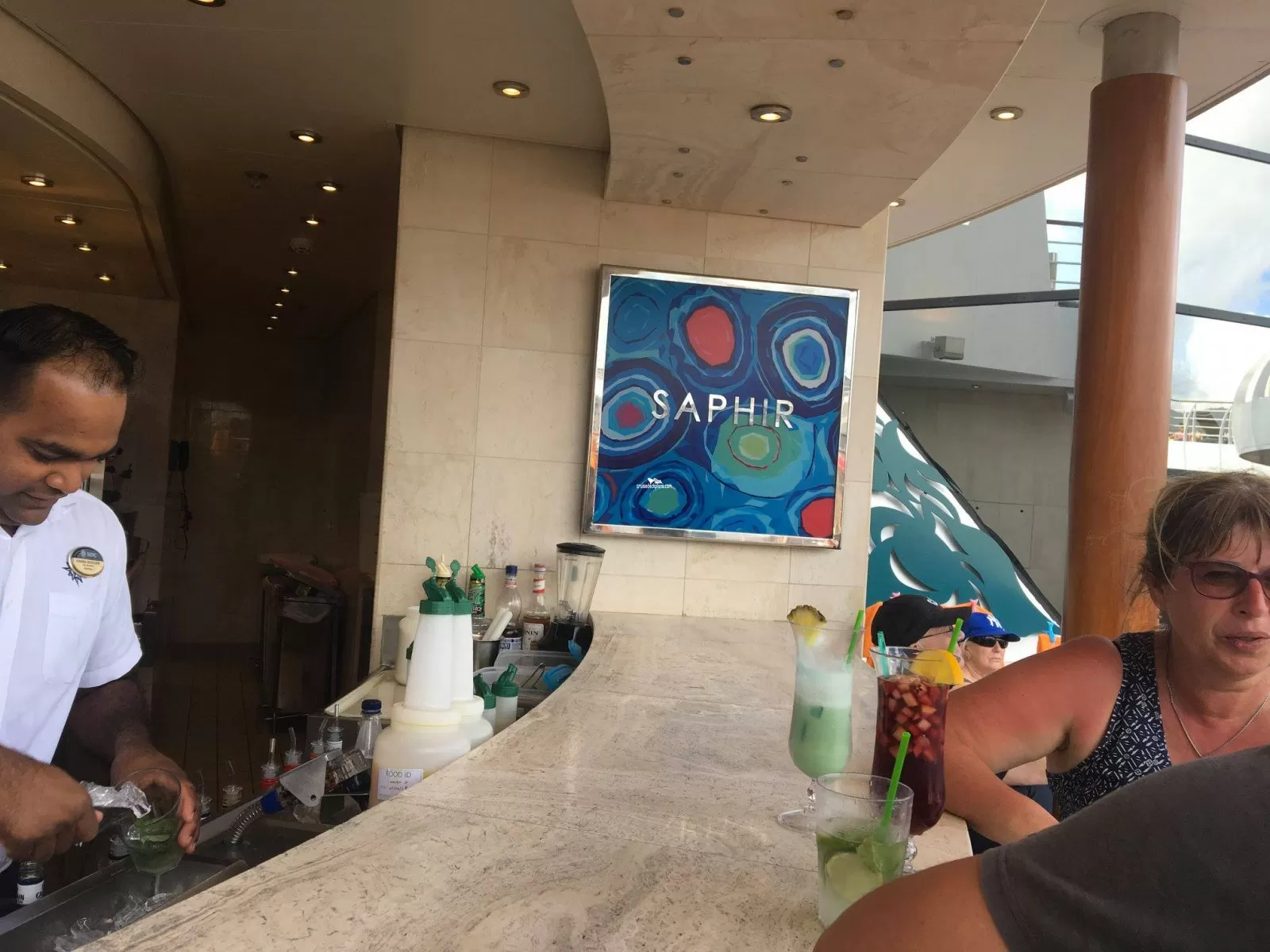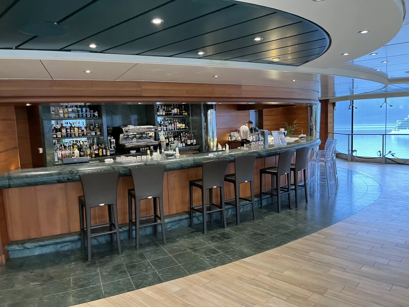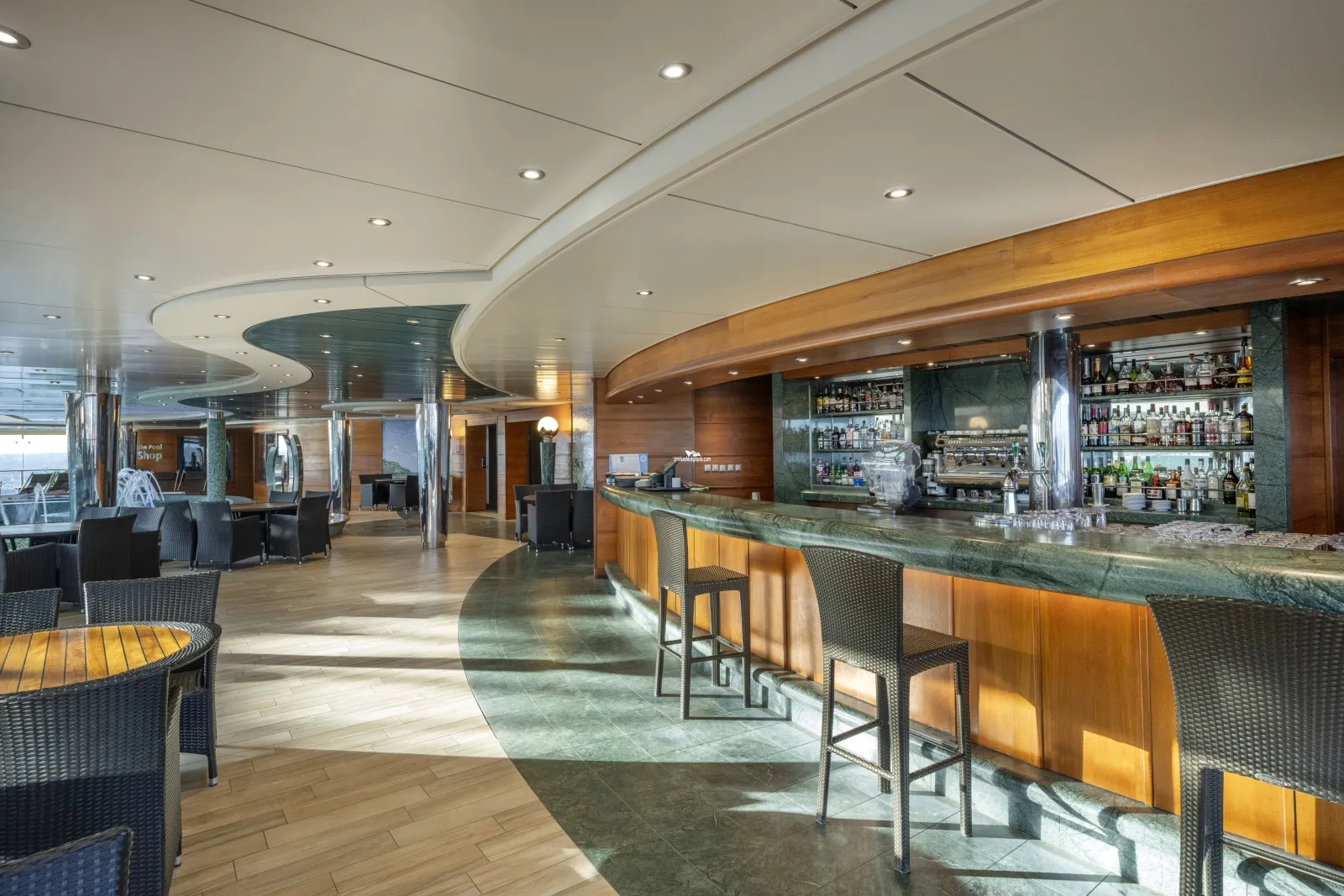 The ship's main pool which as well as the pool itself has tiled splash areas, water jets and fountains along with two whirlpools adjacent to it and a further two overhanging the Aqua Park area.Turquoise Bar
