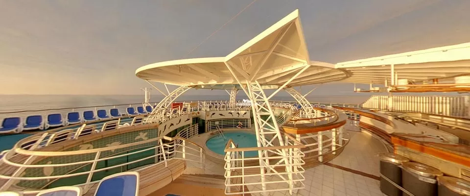 Protected by a space-age dome and with its own bubbling Jacuzzi, it over looks the spa pool and jacuzzis on Deck 12 below. With easy links to the spa, it is a great place for a refreshing post-treatment or post-workout drink. It's also a good place to be for sail away parties and for sipping cocktails at any time of the day.The Plaza