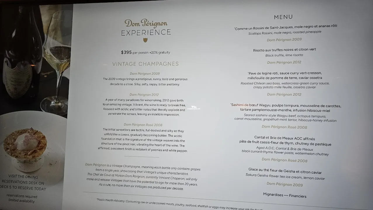 A very small dining room seating up to just 10 guests at a single large Chef\'s Table. You can reserve Privee for the whole evening at a cost of $1,000 (for the entire room). Privee has a suggested seven-course gourmet menu, however this is modified or indeed completely rewritten in a one-to-one consultation with Marina\'s Executive Chef before dining.Cabin Check Tool