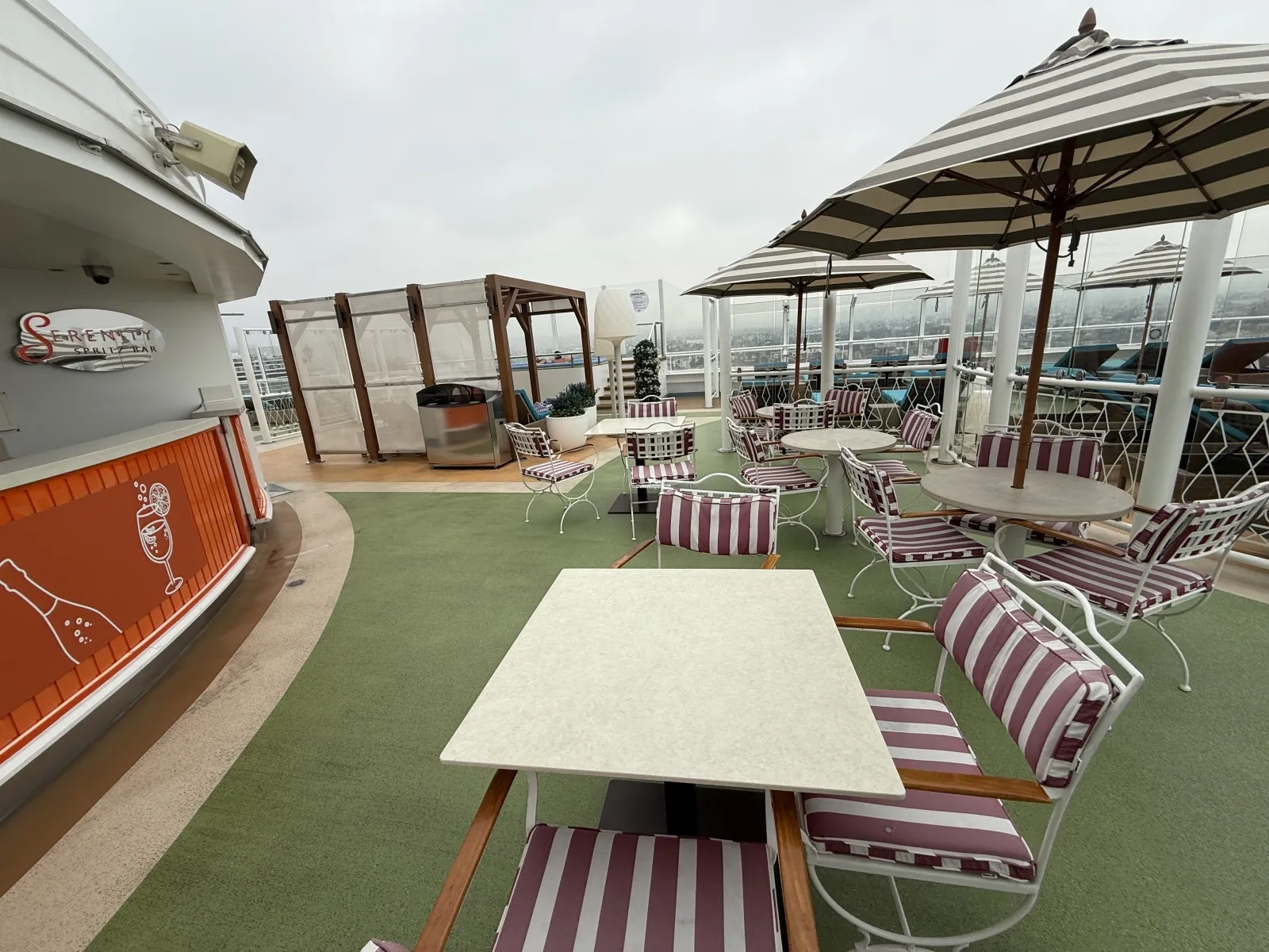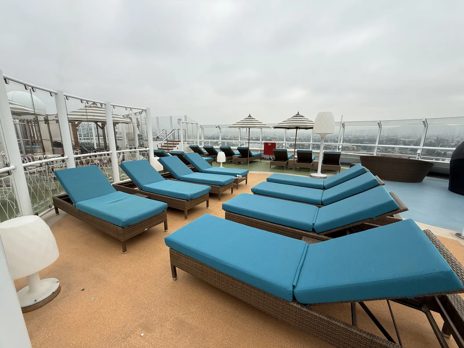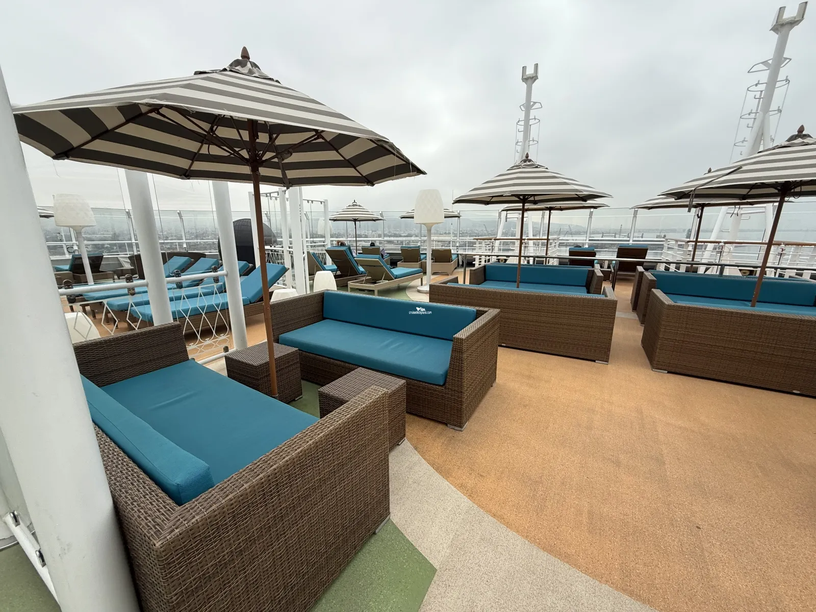 Hours: 8:00am-11:00pm / Hot Tub Spas: 8:00am-12:00am, weather conditions permitting / hours subject to change Adults-Only, outdoor private relaxation area with luxurious chaise lounges, couches, shaded circles, umbrellas, pergolas and dining seating Covered with awnings to create both sunny and shaded areas on both the starboard and portside Hot Tub Spas (2) Guests must be 21 years or older Piped in Music Bar for beverage service ($)Cabin Check Tool