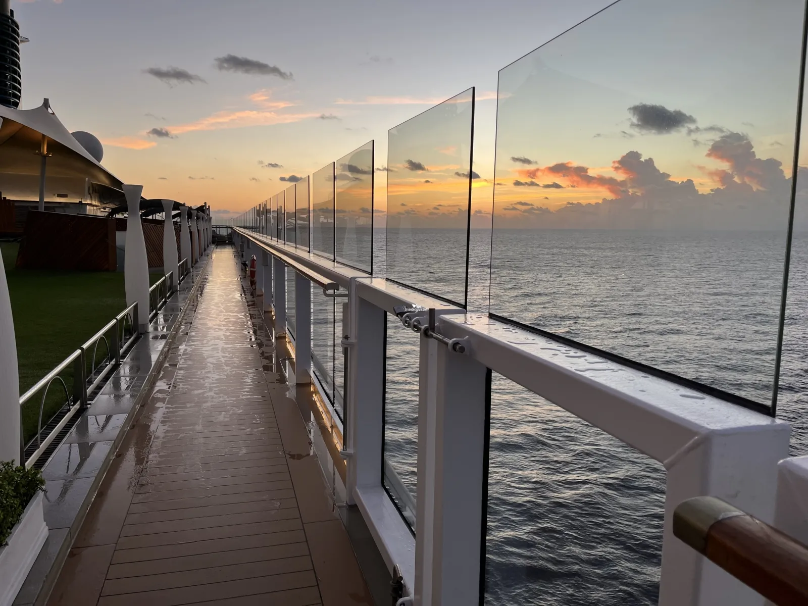 Features 22,927 sq. ft (just over half an acre) of real grass where passengers can sit and relax or take part in lawn games during the day, and open air concerts by night. Also features the Alcoves (8 private cabanas for rental/capacity up to 4 guests each, with panoramic views). Complimentary amenities in the cabanas are fresh fruits plate, chilled towels, 4 water bottles, an iPad (use only, loaded with media and readings), picnic baskets (specialty restaurants food packages- Bistro on Five, Tuscan Grille, Blu, all with 1 wine bottle). At surcharge are offered: a la carte drinks, Wi-Fi access, wine and cheese dinner, etc.Sunset Bar