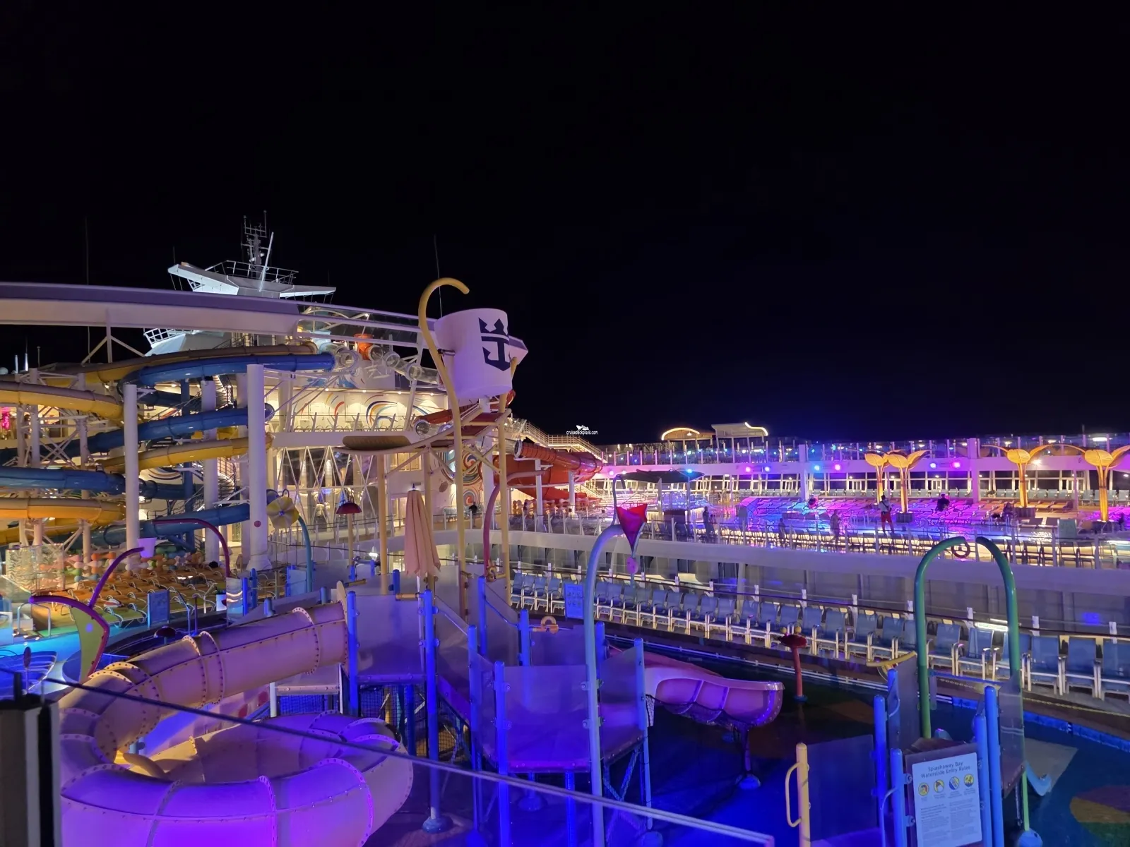 Three multi-story waterslides, all of which twist and turn over Central Park 10 decks below. Exit on deck 15. Port side slide is called The Perfect Storm. Starboard side waterslide is called SupercellSplashaway Bay