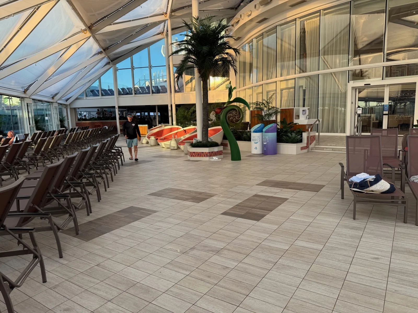Main pool area. This consists of two large size pools located on both the port and starbord side of the ship. There is a large screen showing entertainment.Beach Pool