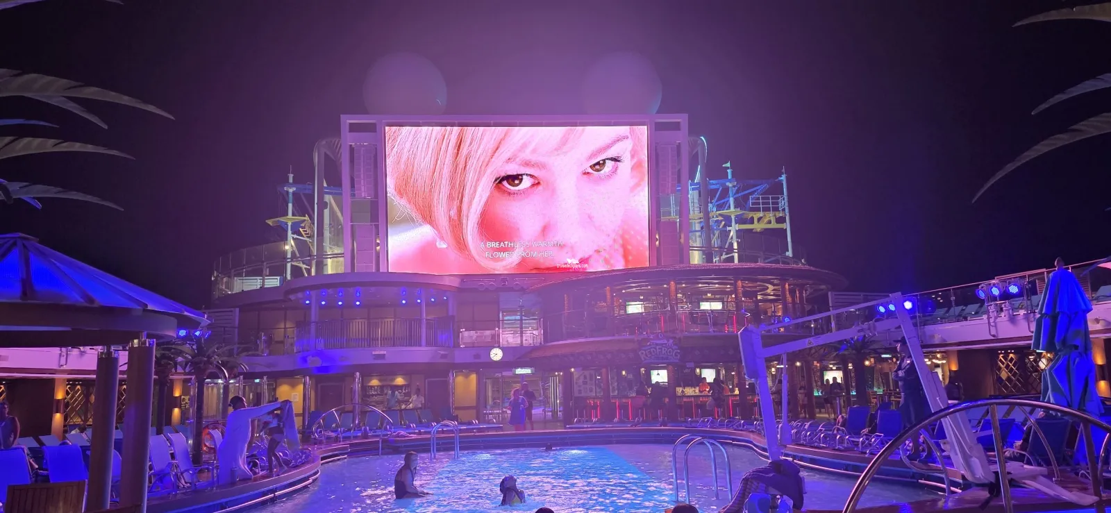 Salt water pool on the aft of deck 16 with 2 whirlpool spas. Lounge chairs, umbrellas and beverage service is offered.Tides Pool Bar
