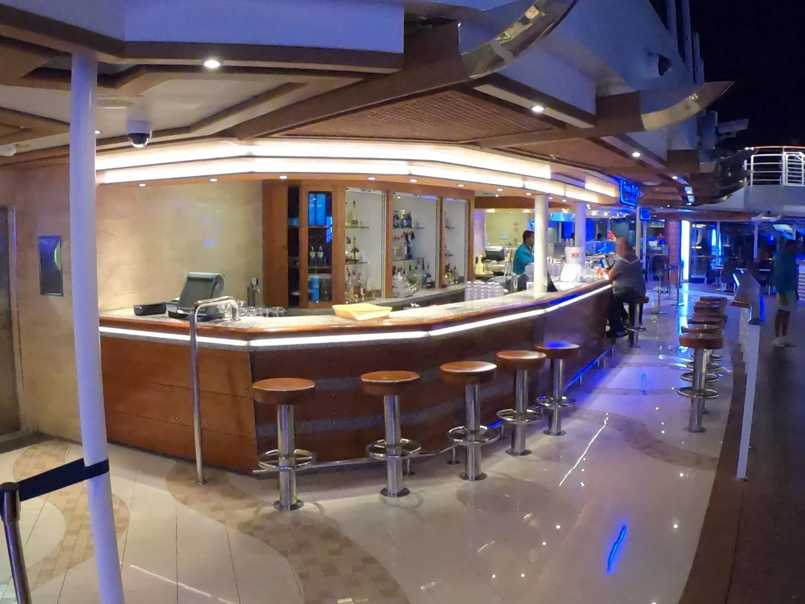 Two level high sea walk that extends out over side of the ship. The first level has a glass floor that allows you to view all the way down to the ocean.Wake View Bar