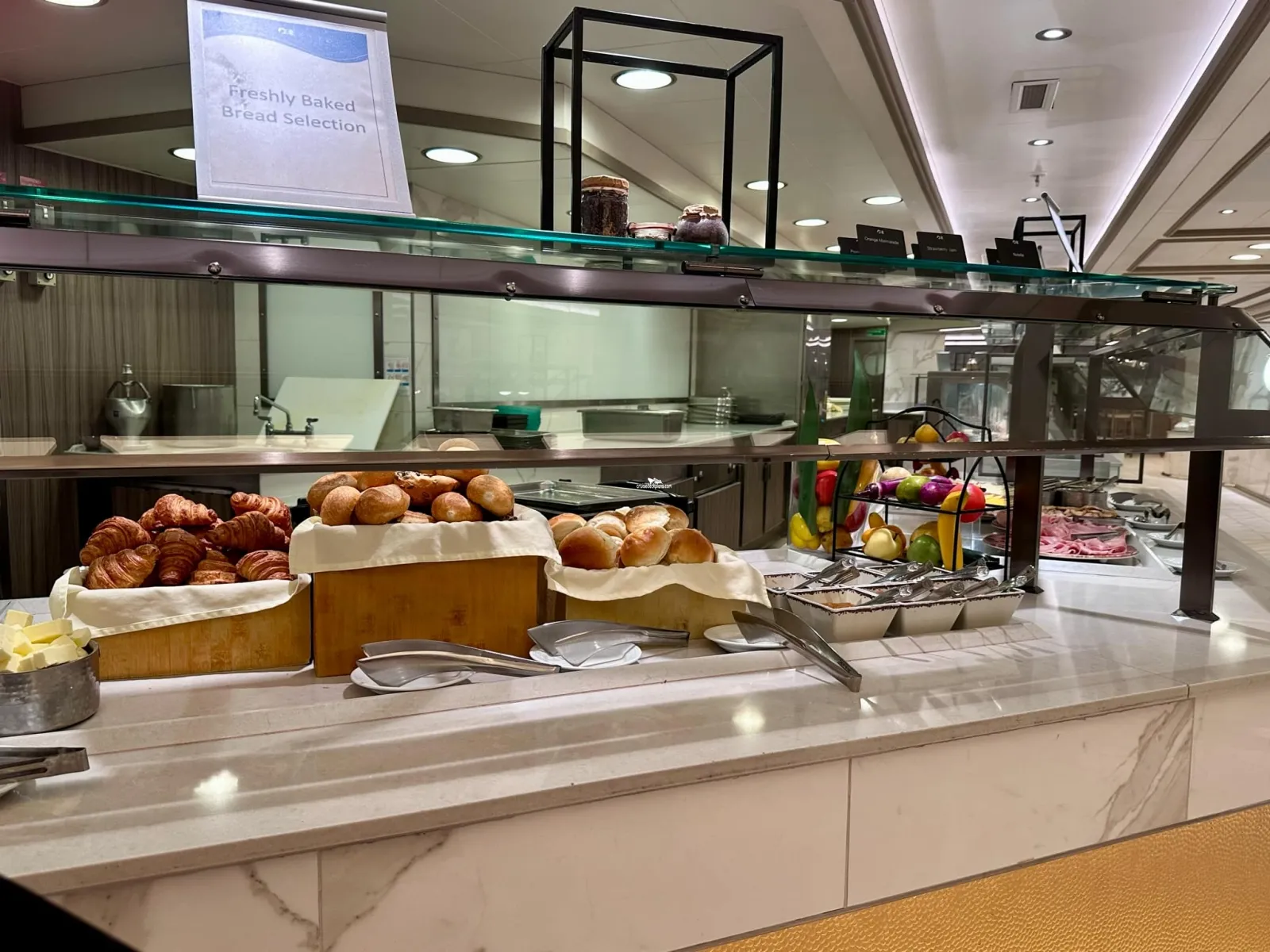 The ship's buffet style dining area with 900 seats. Serves cuisines from around the world including Mediterranean dishes, an Italian pasta speciality counter and a new 'east-meets-west' street food speciality counter.The Bakery inside the World Fresh Marketplace will serve Western, European and Asian pastries.