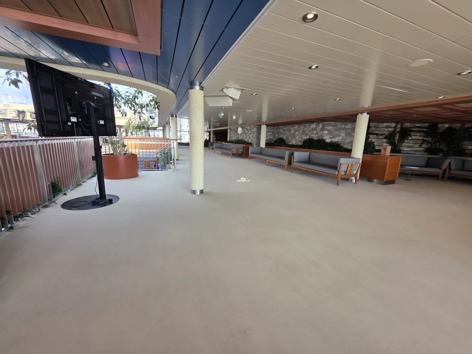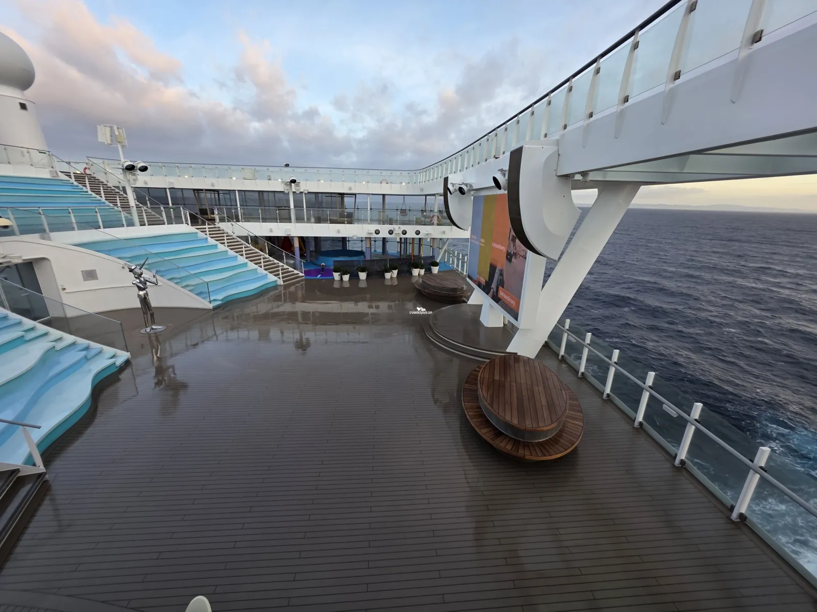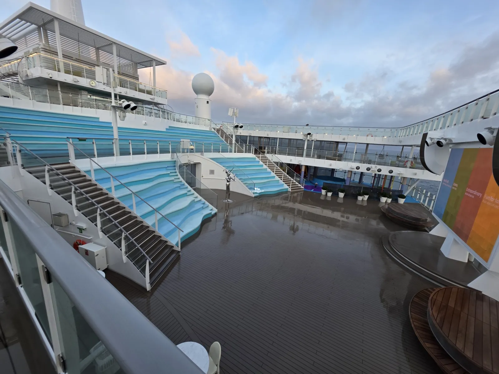 Aft multi-level outdoor stage area with stadium seating, large movie screen and bar. Features a walk way with glass floors.La Spiaggia Beach Club