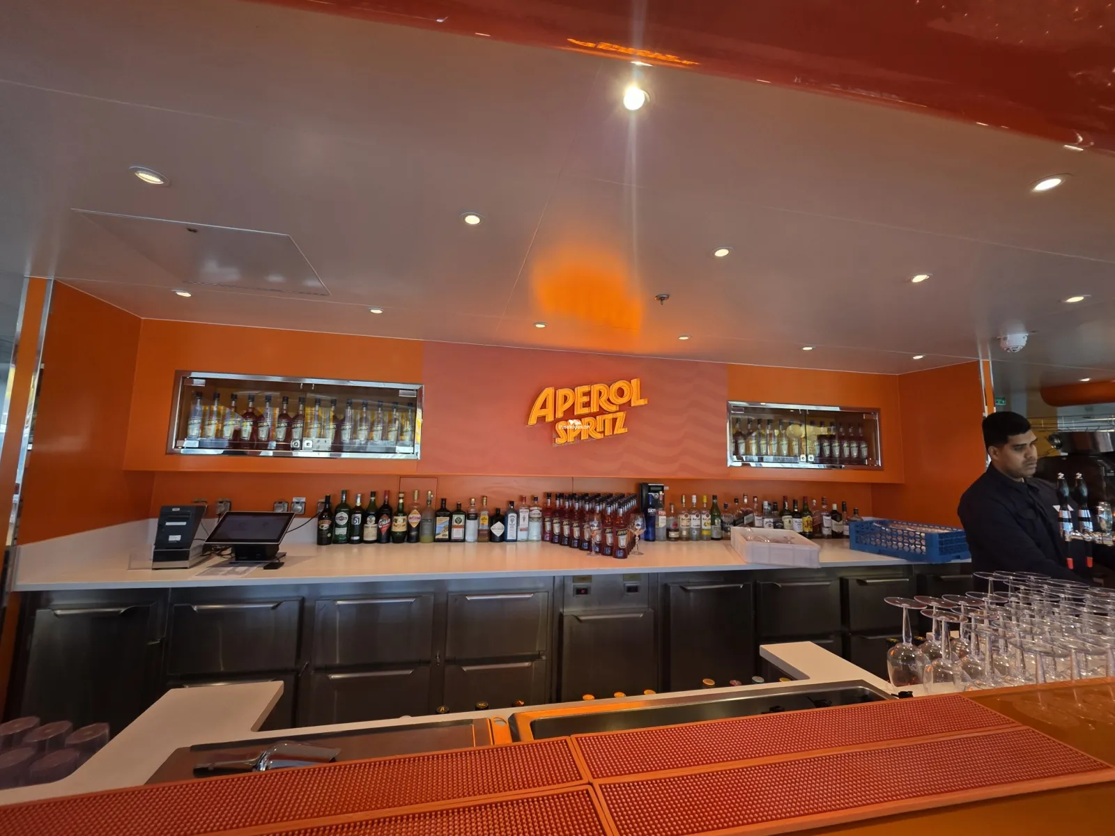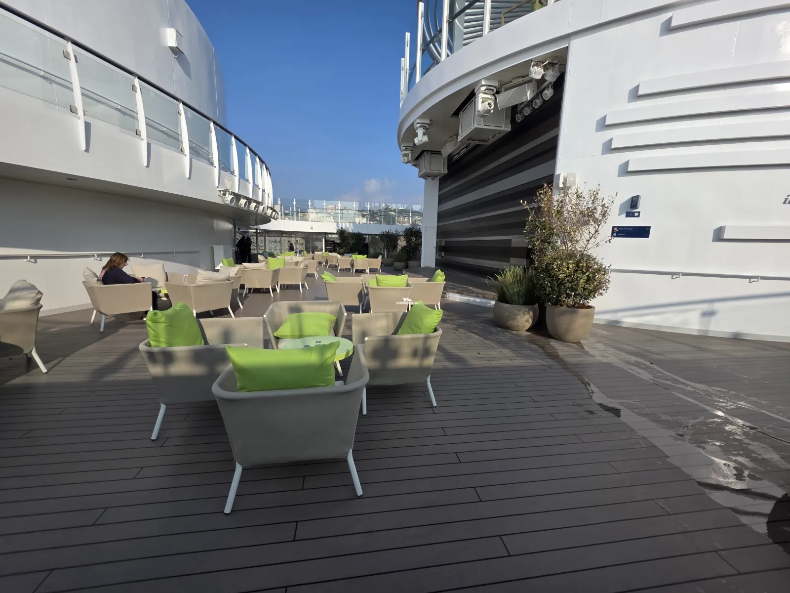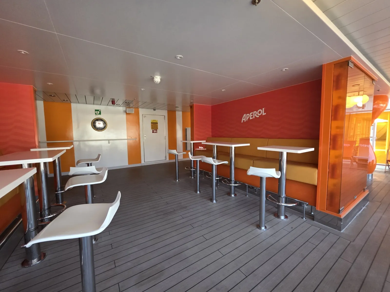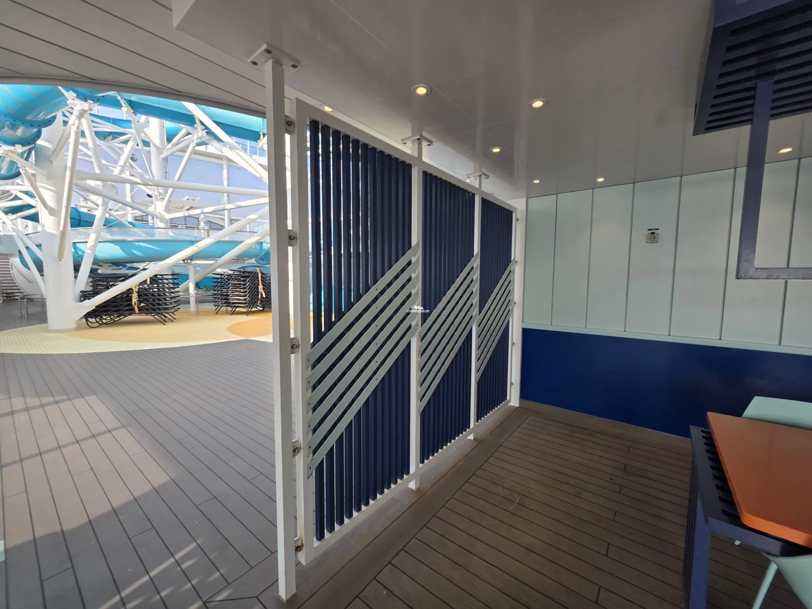 Aft multi-level outdoor stage area with stadium seating, large movie screen and bar. Features a walk way with glass floors.La Spiaggia Beach Club