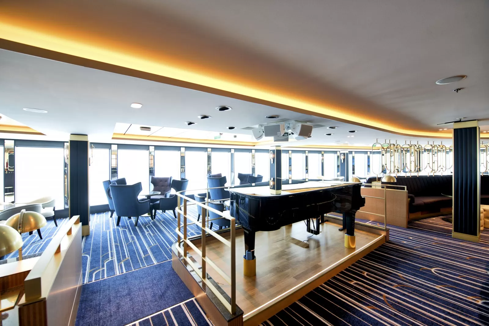 Observation lounge that offers panoramic sea views. Enjoy reading and relaxing during the day. In the evening becomes a cocktail lounge with live pianist.Epicurean