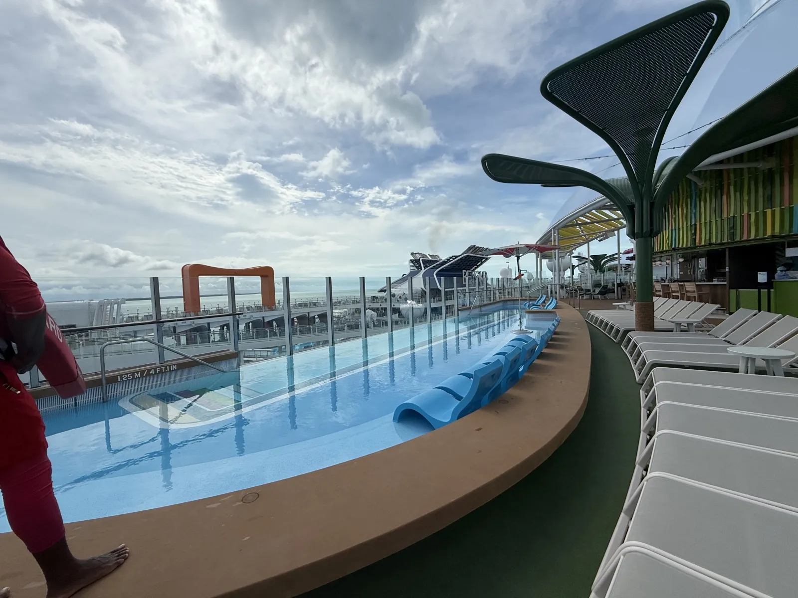 Open-air 4 foot deep narrow pool and nearby cantilevered whirlpool. Plenty of chairs (mostly in the sun). Dedicated Lime & Coconut bar. This is a family pool area.Sports Court