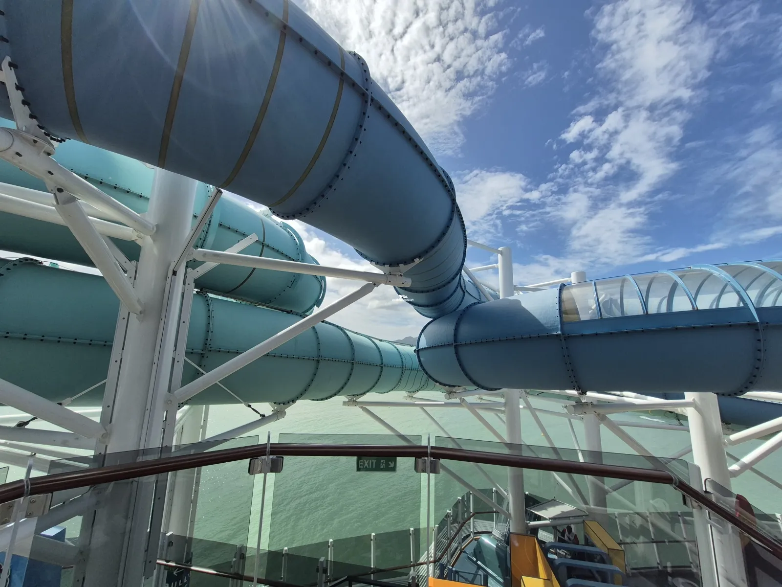 The ride has two tracks and is built to have four sets of two-person rafts in motion at any given time. Loading platform on Deck 18. From there, using powerful magnets riders will be catapulted upward to Deck 20 at speeds of up to 31 miles per hour. The ride consist mostly of opaque tubing but will feature clear sections that will give a brief glimpse of the sea nearly 200 feet below.Tee Time
