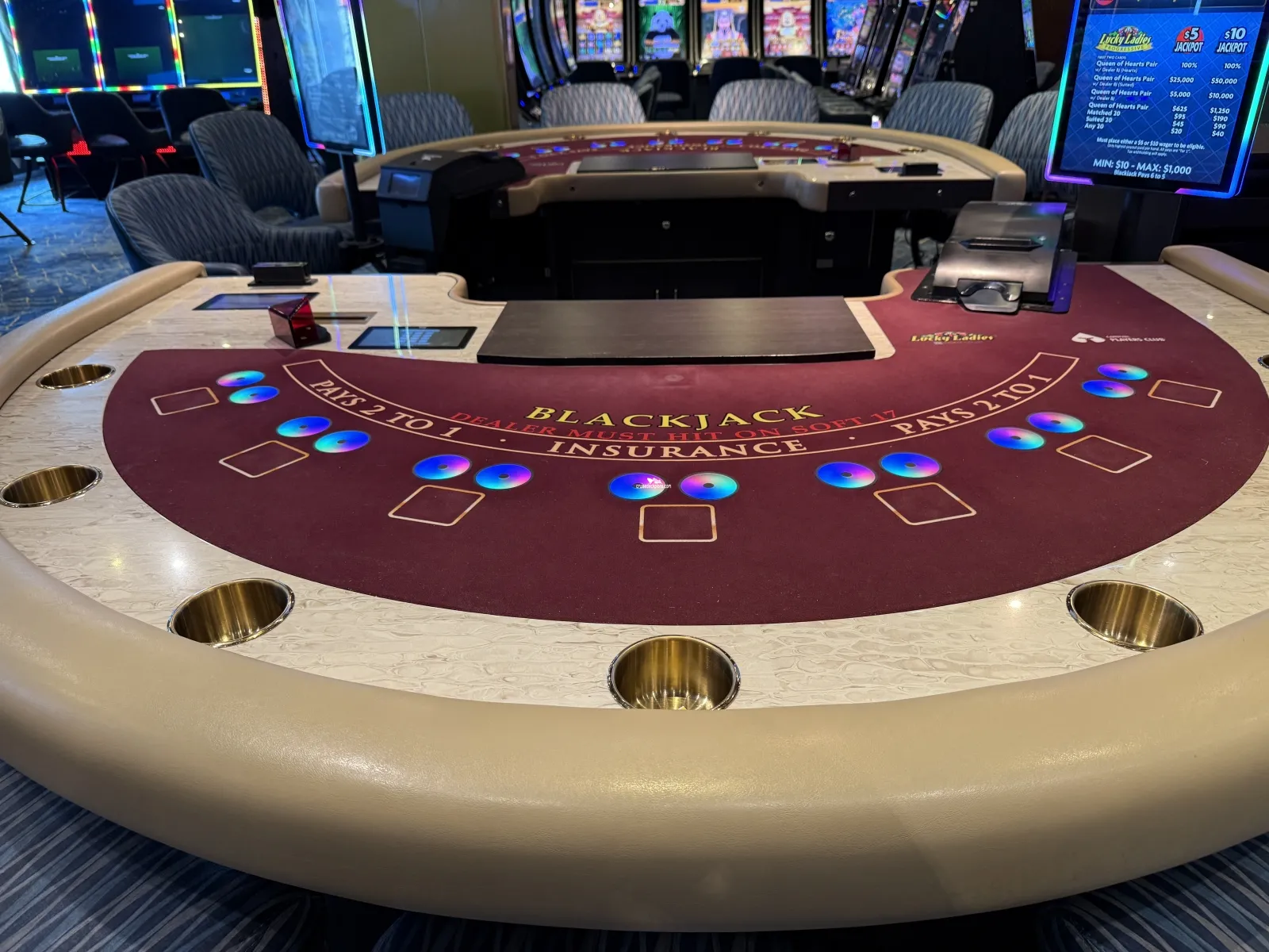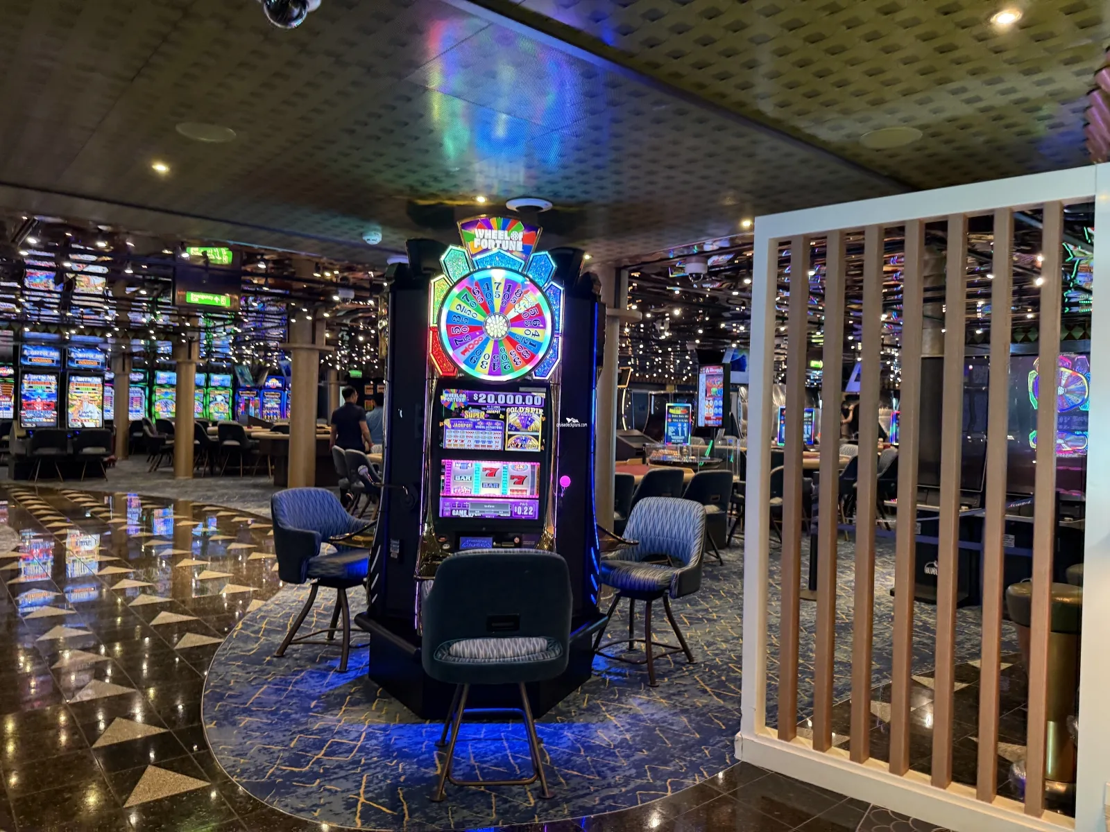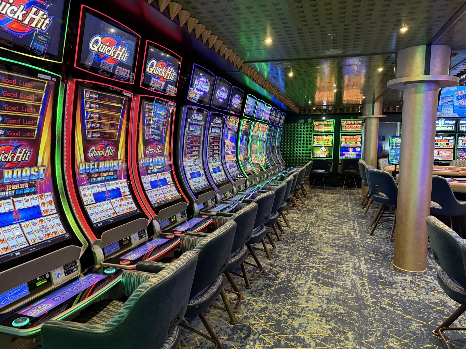 Hours on sea days: slots open early morning to late / tables open late morning to late Hours on port days: closed while the ship is in port; opens after the ship departs port until late Full casino and gaming ($) Beverage ServiceWarehouse (The)