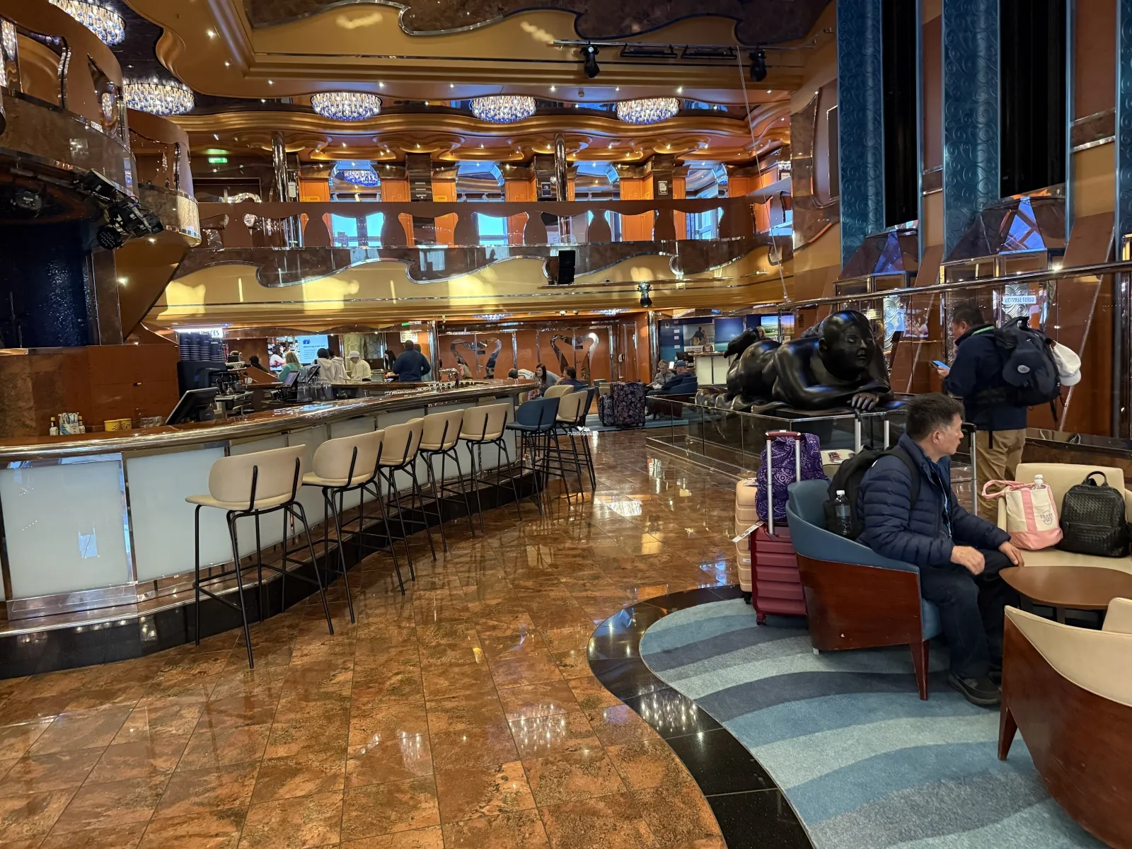 Lobby entrance to the ship. Lounge and bar with seating area. Live music in afternoons and nightly, dance floor and beverage service ($)Carnival Adventures