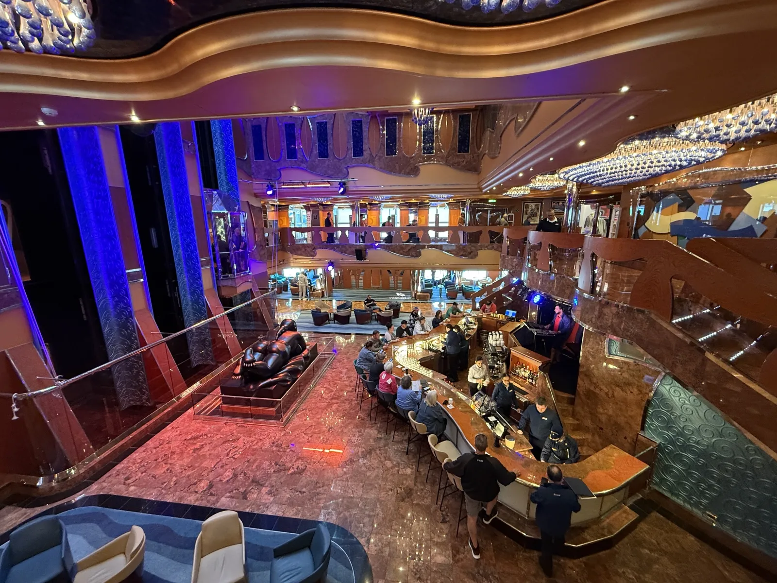 Three level Main show lounge featuring playlist productions, talks and seminars, audience participation games, dance classes. Beverage service is available.Ocean Plaza and Bar