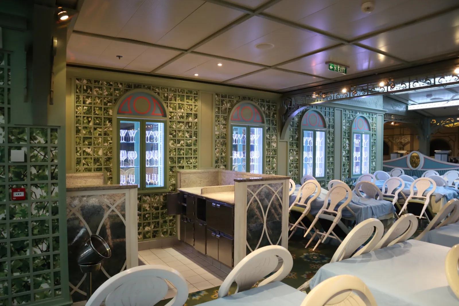 A large-sized Main Dining restaurant inspired by the picturesque gardens of Versailles and open for breakfast, buffet style lunch and dinner.Disney Vacation Club