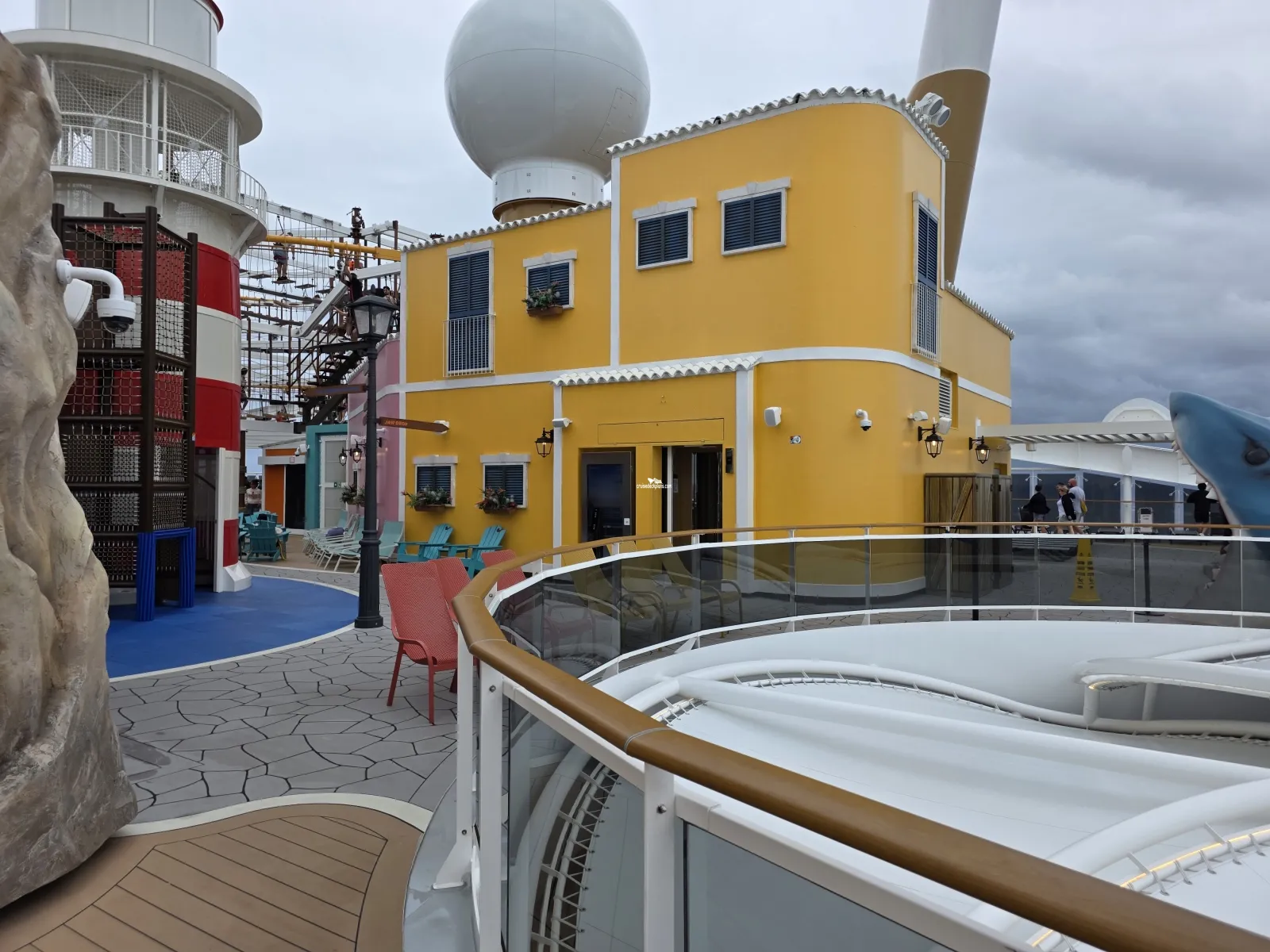 Water slides towering way above the deck and fitted with virtual reality technology to make every run even more exciting. Ropes course.Jaw Drop
