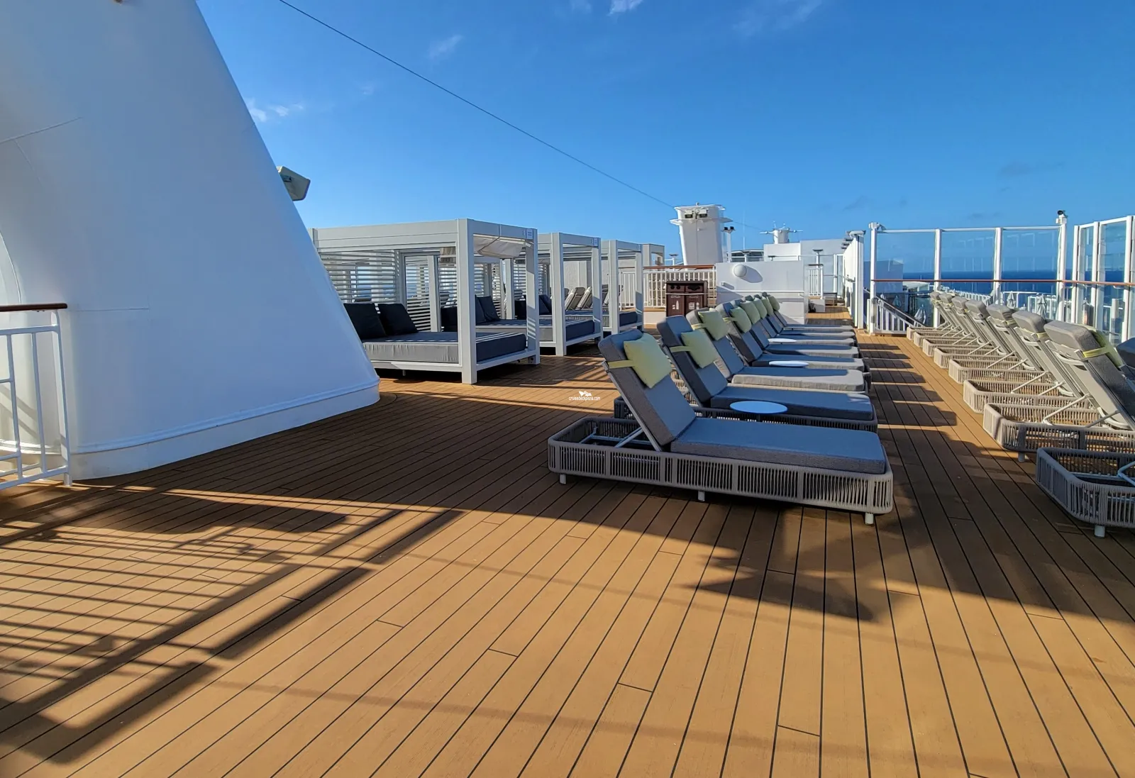 Upper level of the Vibe Beach Club. One of the ship's two over 18's only venues and features an oversized hot tub, luxurious chaise longue and a relaxing water feature. The Beach Club also has its own full liquor bar, refreshing fruit skewers, water spritzers and chilled towels. To access the facilities guests must purchase an access pass.Cabin Check Tool