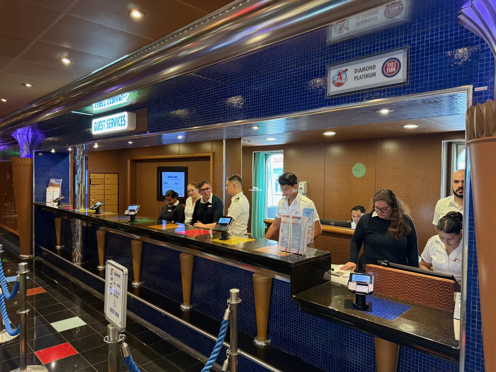 Main lobby with guest services desk, shore excursion desk, bar and lounge seatingExterior Deck