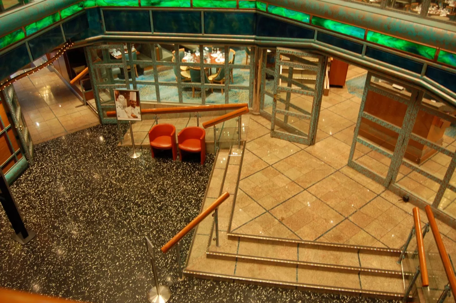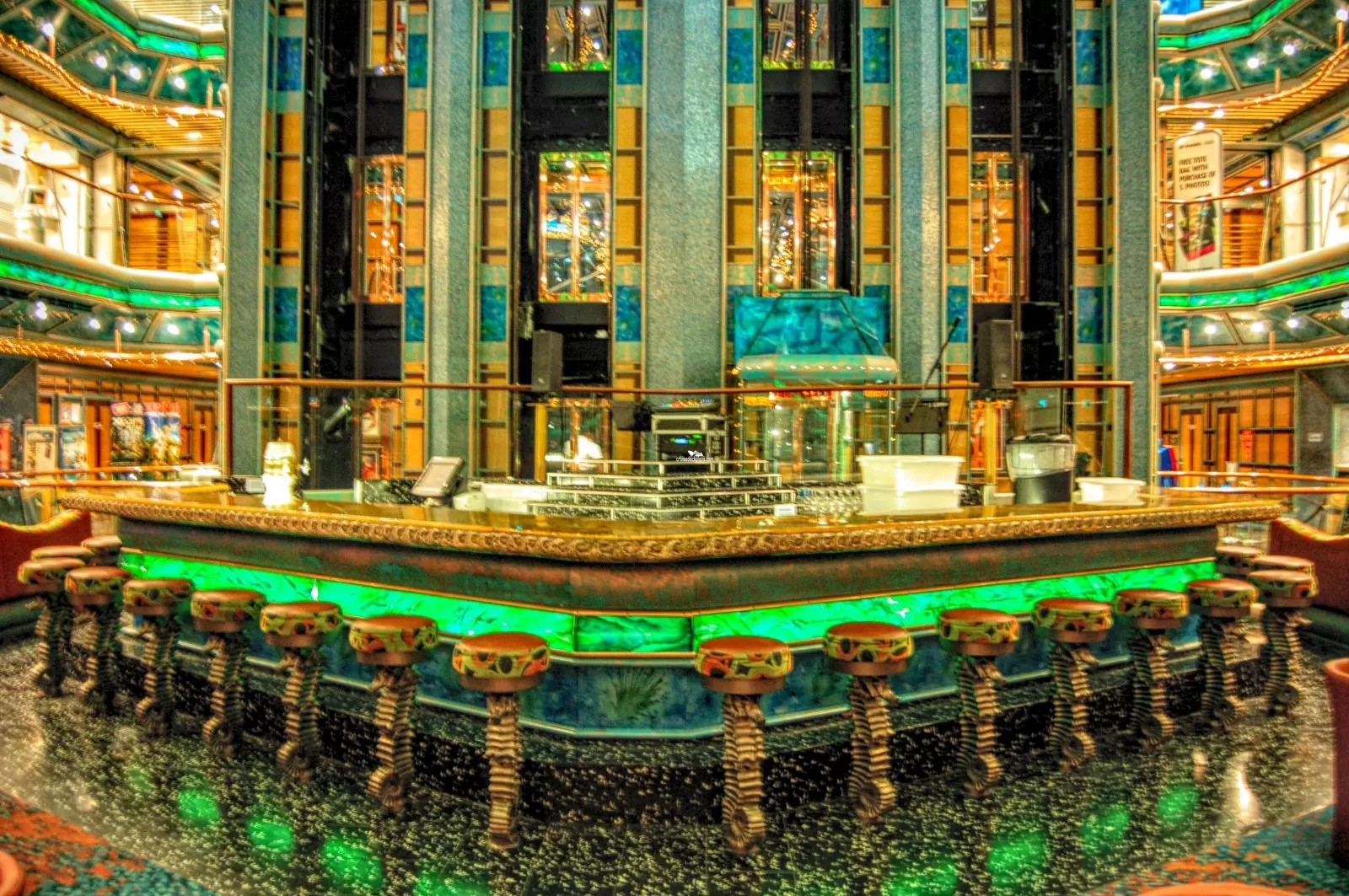Ships atrium. On first level is shore excursion and guest services desks. There is also a large bar and lounge area. This is the one of the main entrances to the ship. There is a seating area with live music in the afternoons and nightly. There is also a dance floor.Exterior Deck
