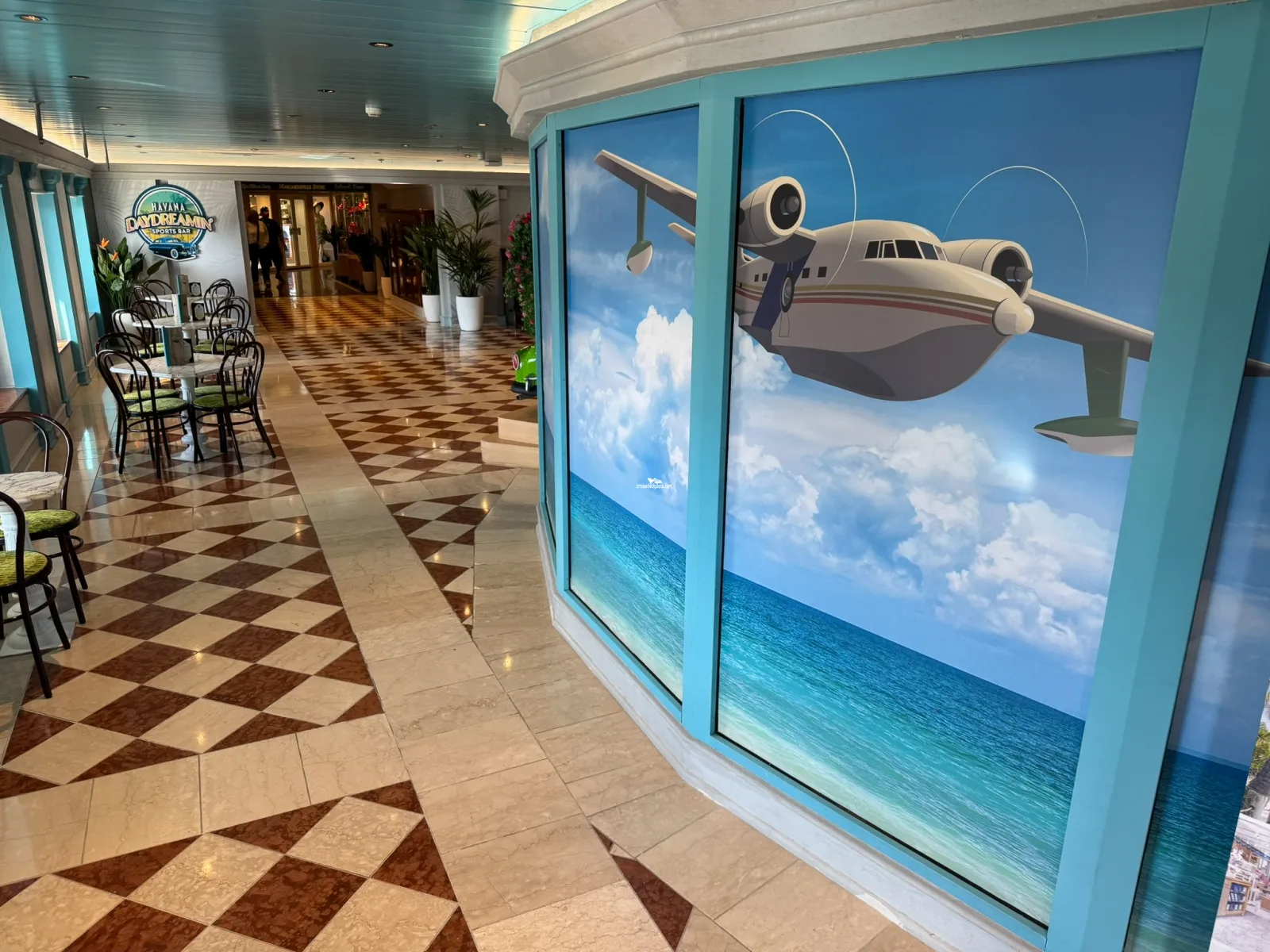 Outer hallway that wraps around the main theater and offers places to sit.Flip Flop Atrium Bar